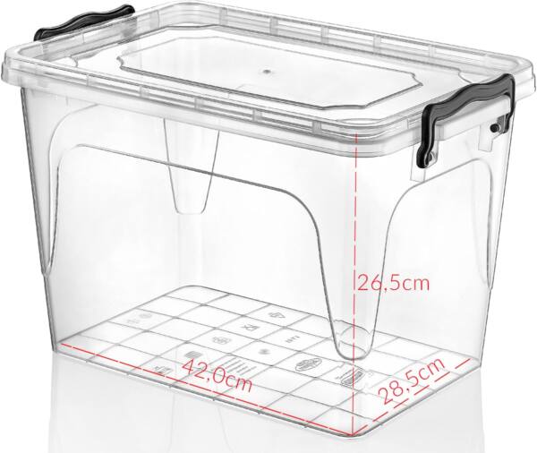 Didelė 21 l talpa su dangteliu. Jos dėka sutvarkyti reikalus bus daug lengviau. Jis turi labai universalią formą, todėl gali būti dedamas praktiškai visur. Tai puikus sprendimas tiek virtuvėje, tiek biure. Jame galite laikyti maistą, kosmetiką, smulkius drabužius, dokumentus, virtuvės reikmenis ar vaikiškus žaislus. Dėl skaidrių sienelių matomas indo turinys. Atidaromas iš viršaus, jis leidžia lengvai pasiekti viduje įdėtus daiktus. Galima laikyti šaldiklyje ir pašildyti mikrobangų krosnelėje. Galima plauti indaplovėje. Talpykla pagaminta iš tvirto plastiko, turi sandarų dangtelį, uždarytą spaustukais. Produktas sertifikuotas sąlyčiui su maistu. Matmenys: 42 x 26,5 (A) x 28,5 cm Renklos spalva parinkta atsitiktinai.