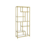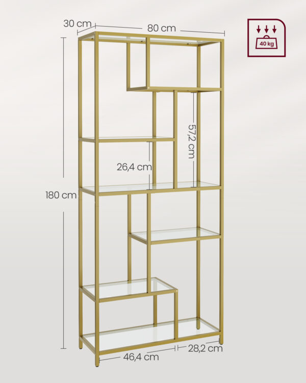 Ši lentyna yra pagaminta iš aukštos kokybės grūdinto stiklo ir tvirto plieno, užtikrinančio ilgaamžiškumą ir stabilumą. Jos metalinis auksinis atspalvis suteikia modernumo ir elegancijos, puikiai derančios su įvairiais interjero stiliais.