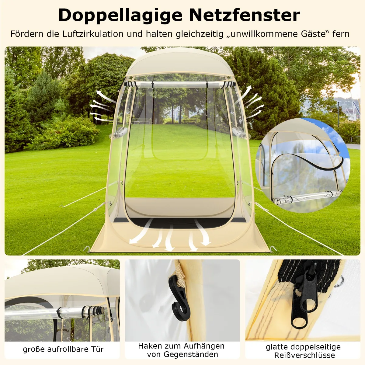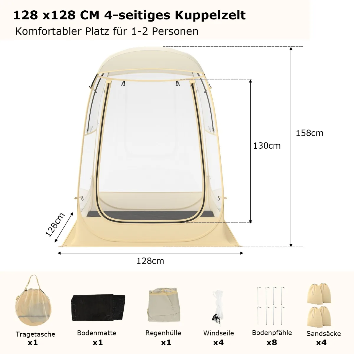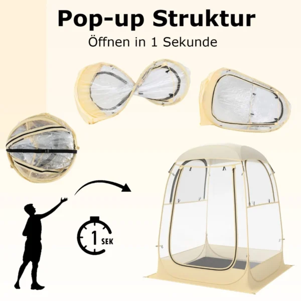 Skaidri palapinė 128x128x158 cm, kreminės spalvos, skirta lauko renginiams ir stovyklavimui. Permatoma PVC medžiaga suteikia platų panoraminį vaizdą ir užtikrina gerą matomumą lauke. Palapinė yra atspari oro sąlygoms ir lengvai pastatoma per kelias sekundes.