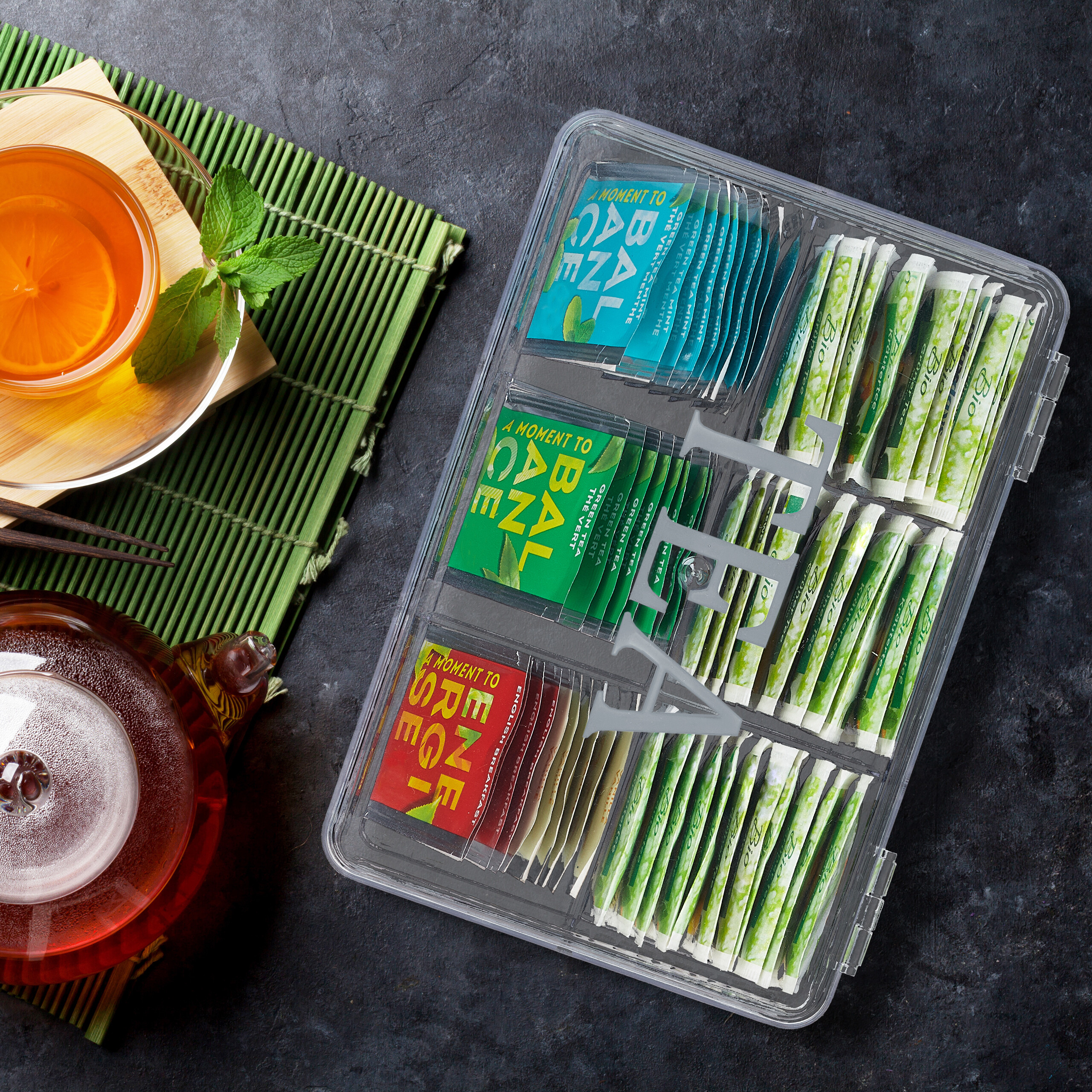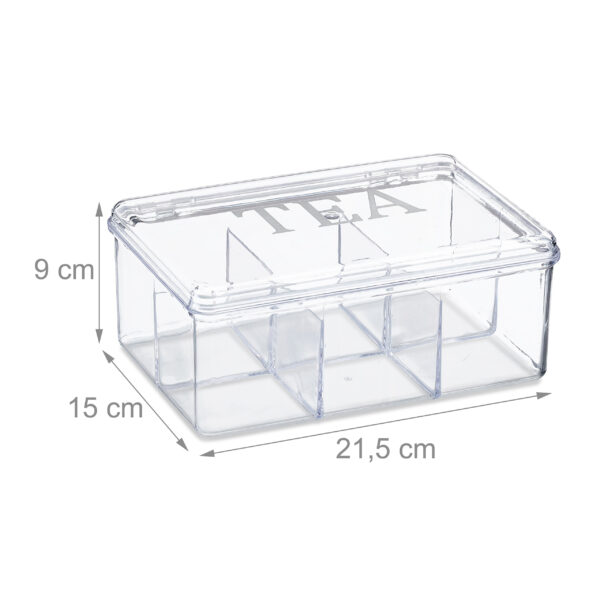 - 6 Skyriai: Kiekviename skyriuje telpa iki 10 arbatos maišelių, todėl visada turėsite mėgstamą arbatą po ranka.