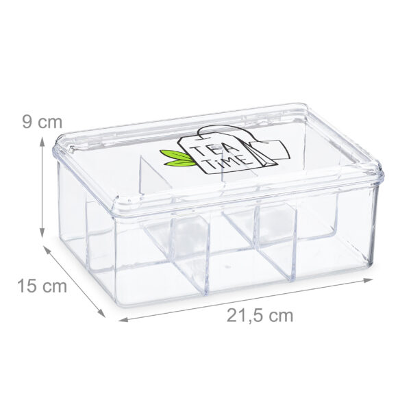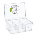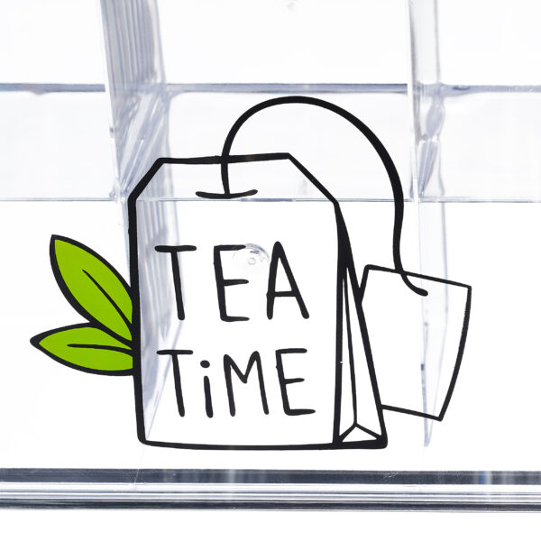 Šis elegantiškas ir funkcionalus skaidrus arbatos maišelių organizatorius yra puikus sprendimas tiems, kurie nori tvarkingai laikyti savo mėgstamą arbatą. Su subtiliais žalios ir juodos spalvos motyvais, šis organizatorius ne tik padeda išlaikyti tvarką, bet ir suteikia stilingą akcentą jūsų virtuvės interjerui.