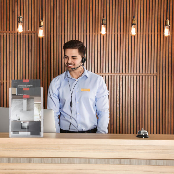 - Efektyvus pateikimas: 3 pakopų dizainas leidžia efektyviai pateikti A4 arba DIN ilgio brošiūras.