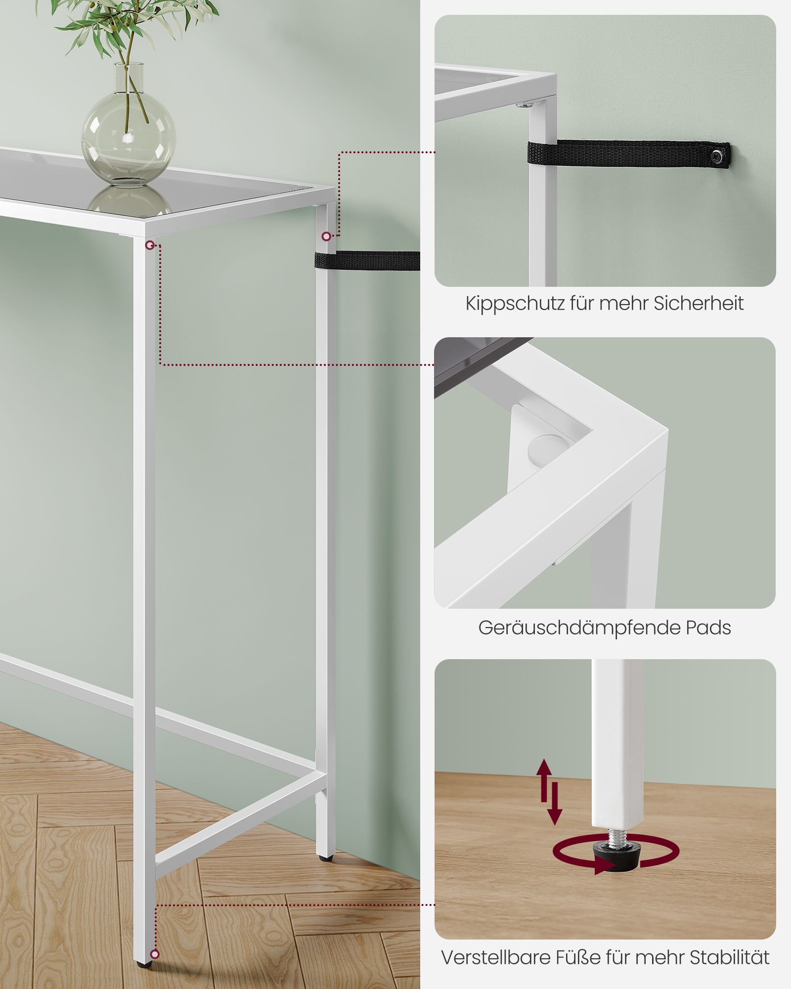 Šis stalas yra ne tik stilingas, bet ir funkcionalus. Jo tvirtas plieninis rėmas užtikrina stabilumą, o skaidrus stiklas suteikia erdvei lengvumo. Tai puikus pasirinkimas tiek svetainėje, tiek prieškambaryje ar darbo kambaryje.