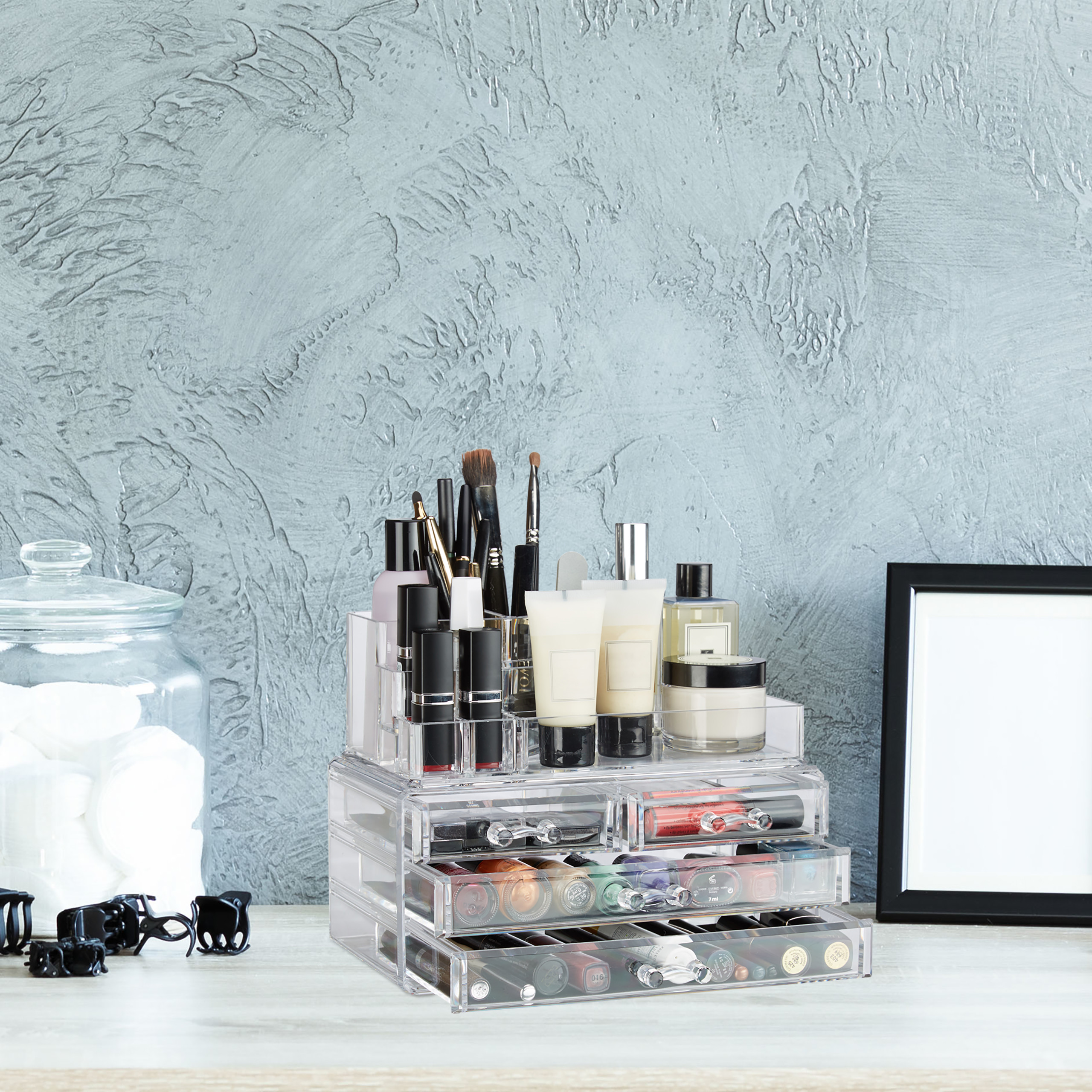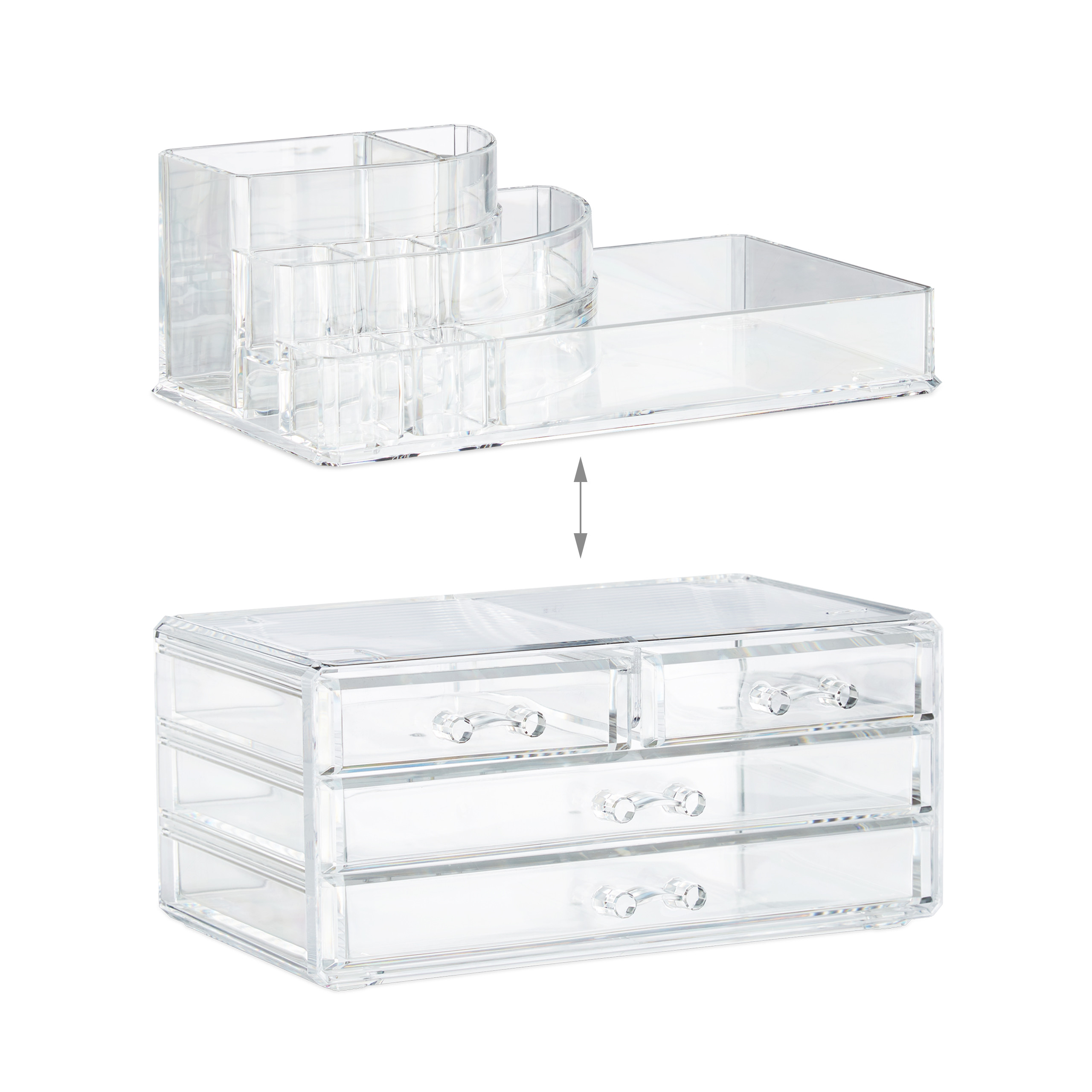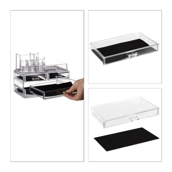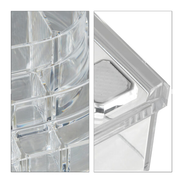 Šis elegantiškas ir funkcionalus makiažo organizatorius yra puikus sprendimas tiems, kurie nori tvarkingai ir stilingai laikyti savo kosmetiką bei papuošalus. Pagamintas iš aukštos kokybės akrilo, šis dviejų dalių laikiklis ne tik padeda sutaupyti vietos, bet ir suteikia jūsų erdvei modernų ir švarų įvaizdį.