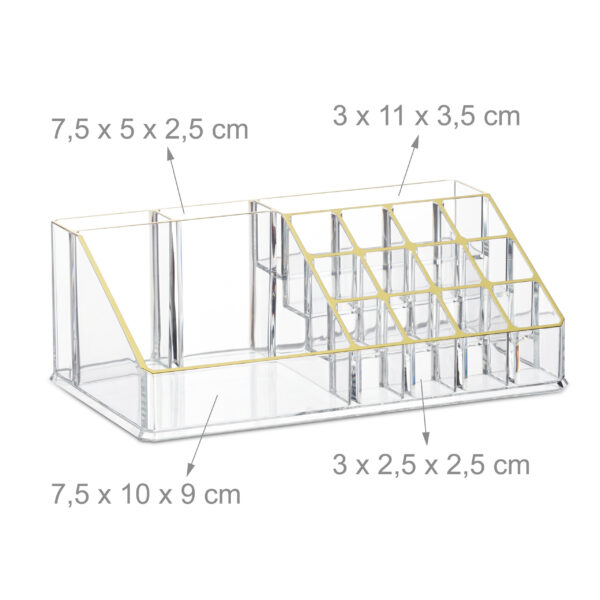 Ar pavargote raustis po kosmetikos krepšį, ieškodami mėgstamiausių grožio priemonių? Mūsų skaidrus makiažo organizatorius yra idealus sprendimas, suteikiantis tvarką ir estetiką jūsų kosmetikos kolekcijai. Šis elegantiškas ir funkcionalus organizatorius padės jums lengvai rasti viską, ko reikia, ir tuo pačiu papuoš jūsų vonios ar miegamojo interjerą.