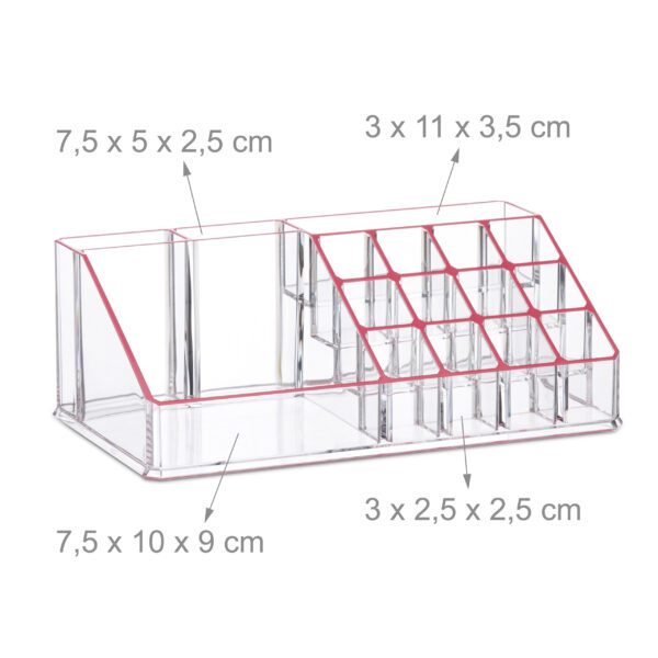 - 20 skyrių: Pakankamai vietos nagų lakui, lūpų dažams, šepečiams ir kitoms grožio priemonėms.