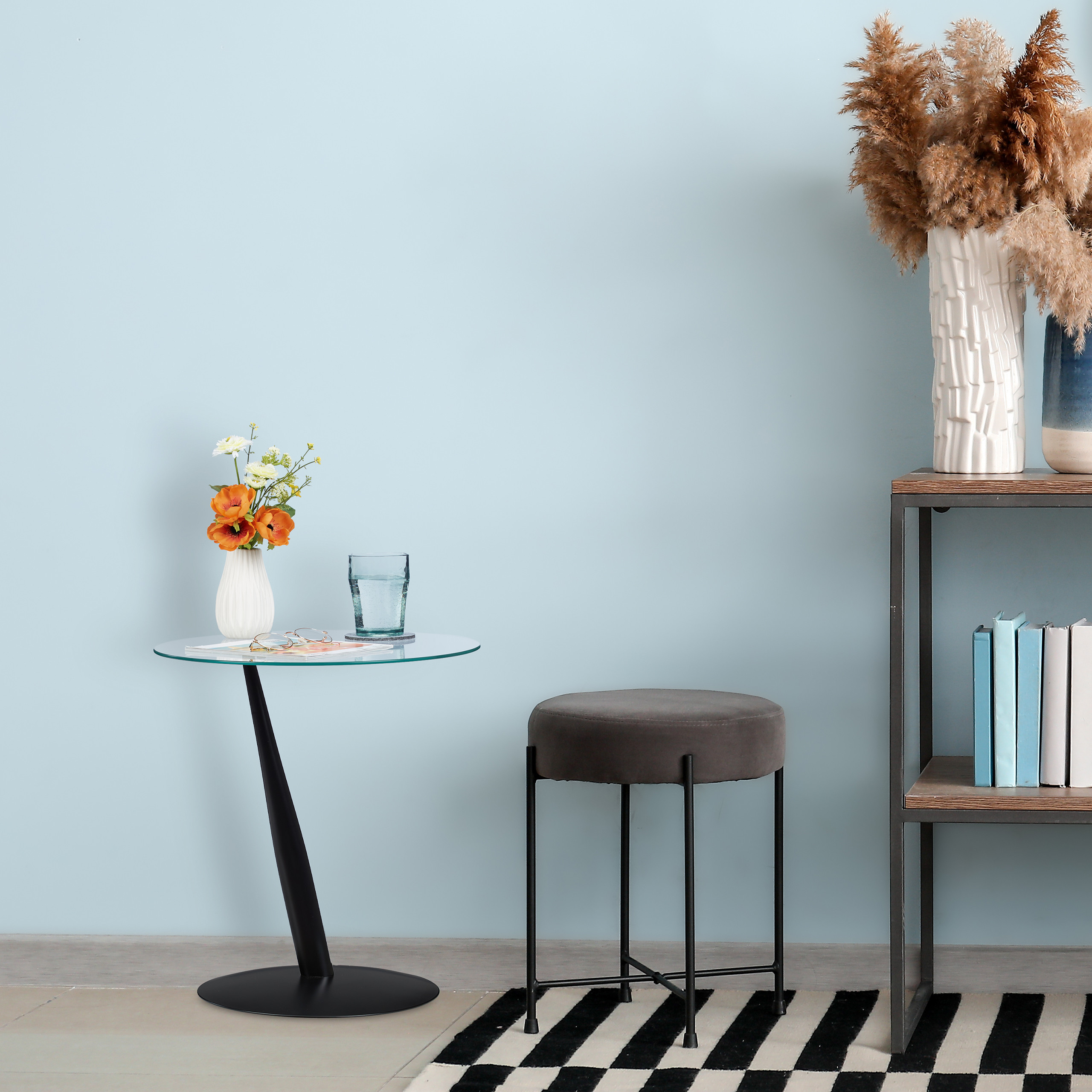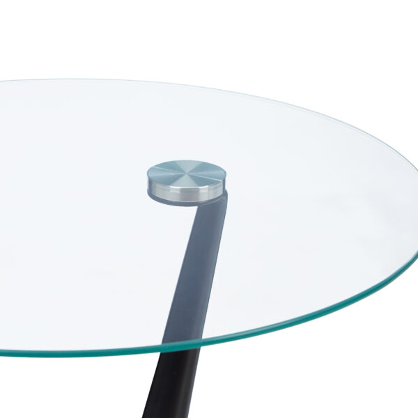 Įneškite modernumo ir elegancijos į savo namus su šiuo išskirtiniu šoniniu staliuku. Jo apvalus stiklinis stalviršis ne tik suteikia šiuolaikišką išvaizdą, bet ir yra itin praktiškas sprendimas jūsų svetainėje ar studijoje.