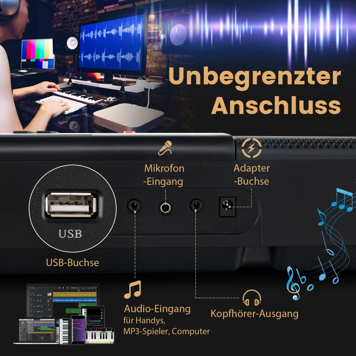 - Ausinių ir mikrofono lizdai privačiam praktikos ir dainavimo kartu su muzika.