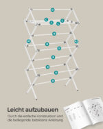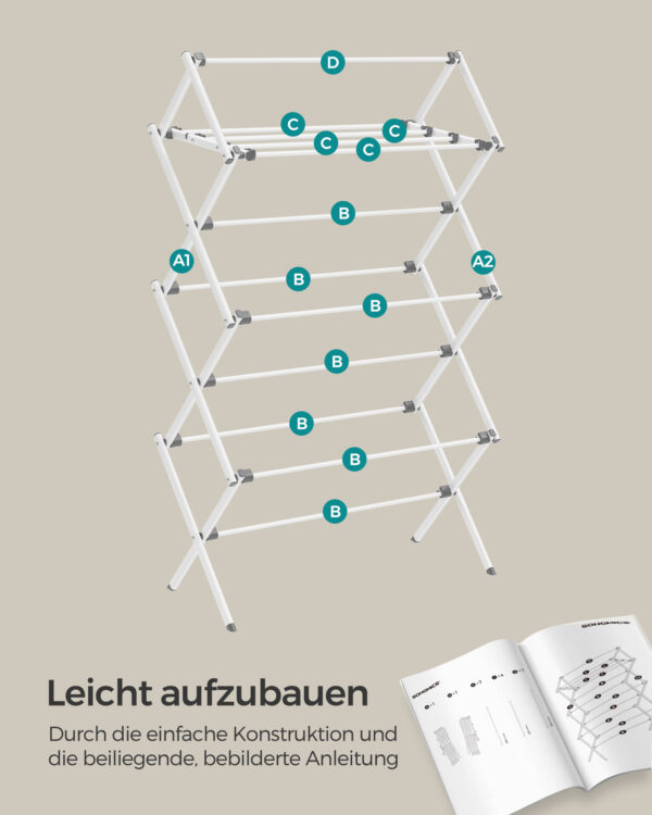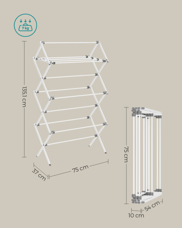 Pagaminta iš aukštos kokybės plieno ir polipropileno (PP), ši džiovykla yra tvirta ir ilgaamžė. Išskleistas dydis yra 37 x 75 x 135,1 cm, o sulenktas – 10 x 54 x 75 cm, todėl ją lengva laikyti, kai nenaudojama.