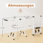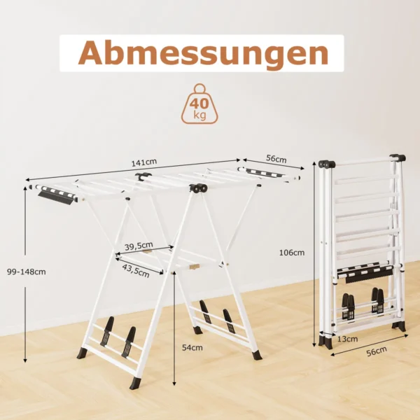 Skalbinių džiovyklė 141x56x148 cm, baltos ir juodos spalvos, tai praktiškas sprendimas rūbų ir įvairių skalbinių džiovinimui namuose ar lauke. Laisvai pastatoma konstrukcija su reguliuojamo aukščio sparnais suteikia daug vietos drabužiams bei užtikrina gerą oro cirkuliaciją. Tinka naudoti tiek bute, skalbykloje, tiek balkone ar sode.