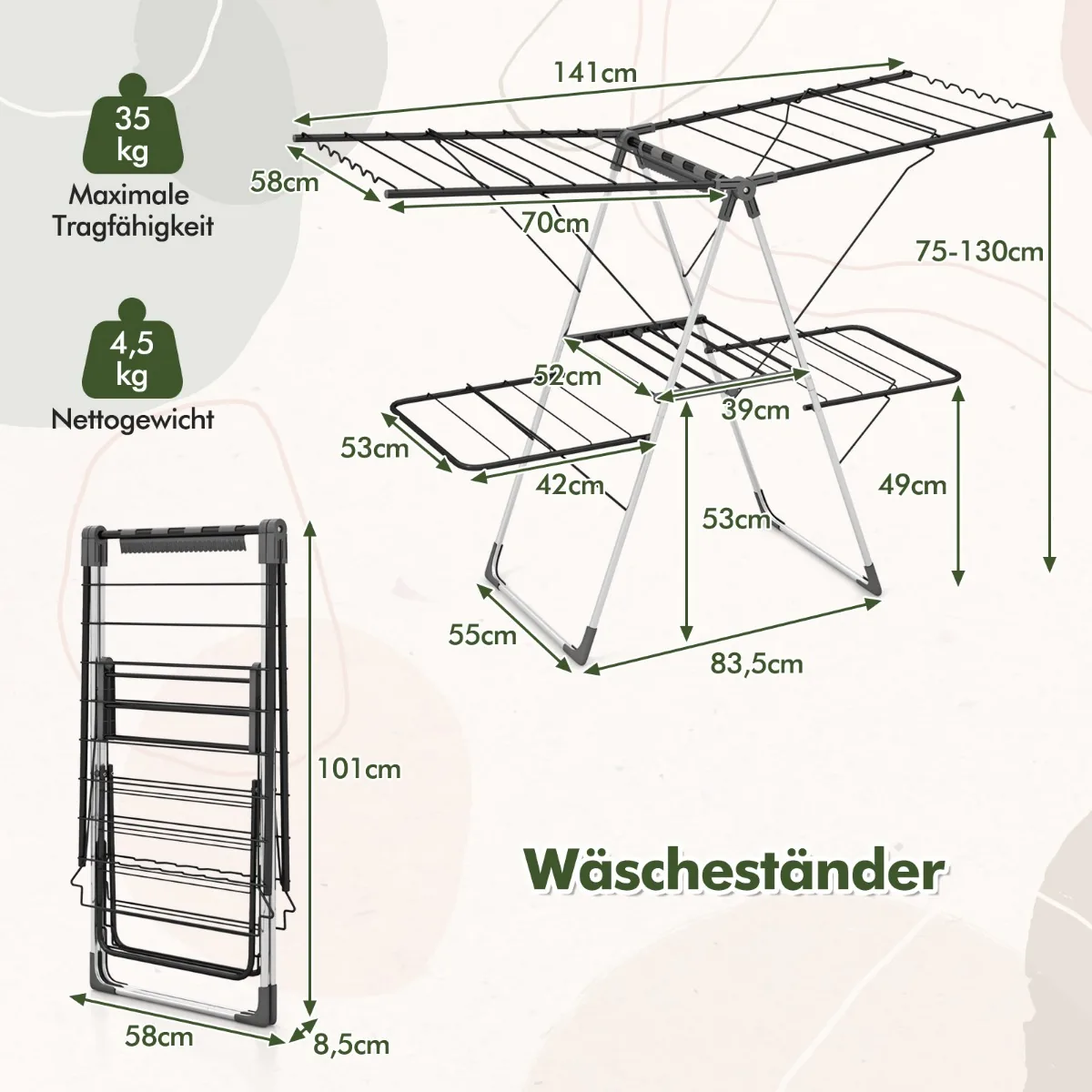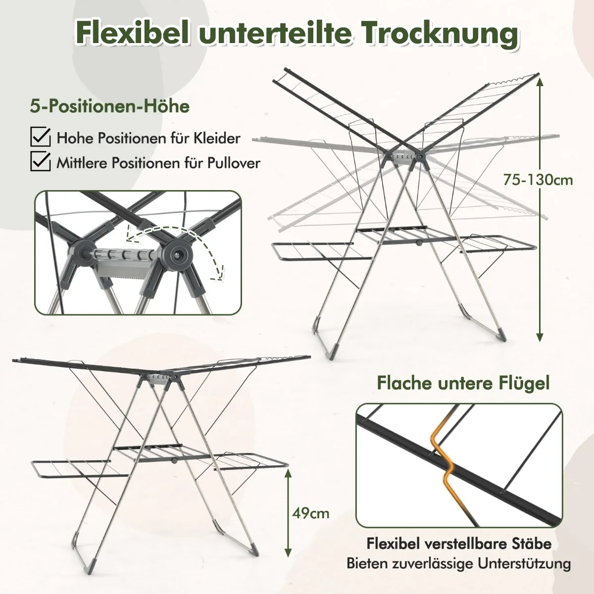 - Du viršutiniai, 5 padėčių reguliuojami sparnai (75–130 cm aukščio) prisitaiko prie skirtingos skalbinių ilgio.