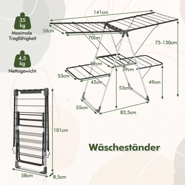 Skalbinių džiovyklė 141x58x130cm, sidabrinės ir juodos spalvos, yra funkcionali ir talpi drabužių džiovinimo sistema. Ji skirta efektyviam skalbinių išdžiovinimui įvairių dydžių ir tipų drabužiams, suteikiant daug vietos 2 lygiuose su reguliuojamais sparnais.