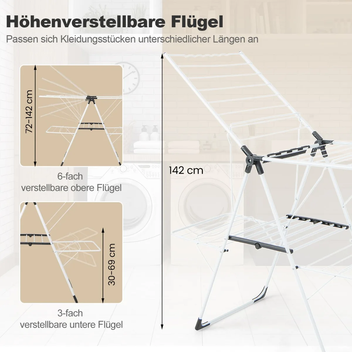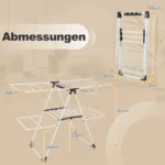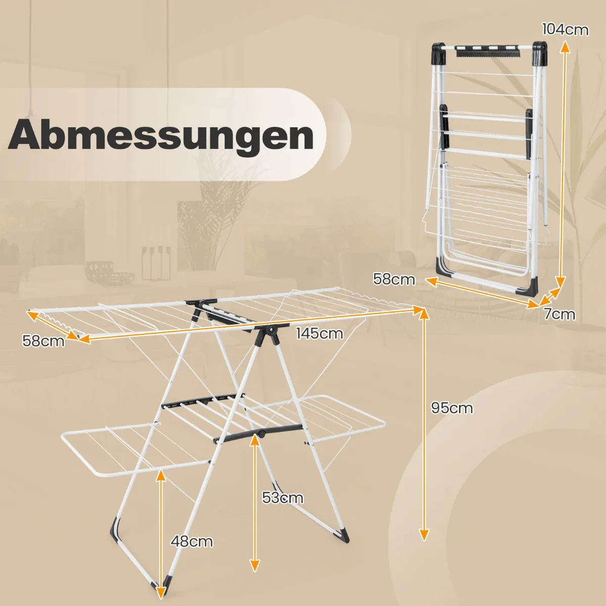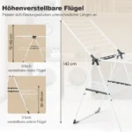 Skalbinių džiovyklė 145x58x95 cm, baltos/juodos spalvos, skirta efektyviam drabužių džiovinimui tiek namuose, tiek lauke. Sulankstoma konstrukcija leidžia taupyti vietą, o reguliuojami sparnai pritaikomi skirtingo ilgio skalbiniams. Metalinis rėmas užtikrina tvirtumą ir stabilumą naudojant įvairiomis sąlygomis.