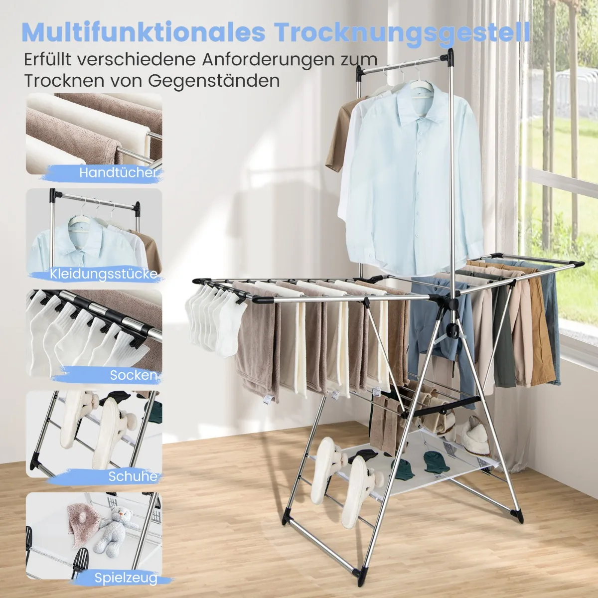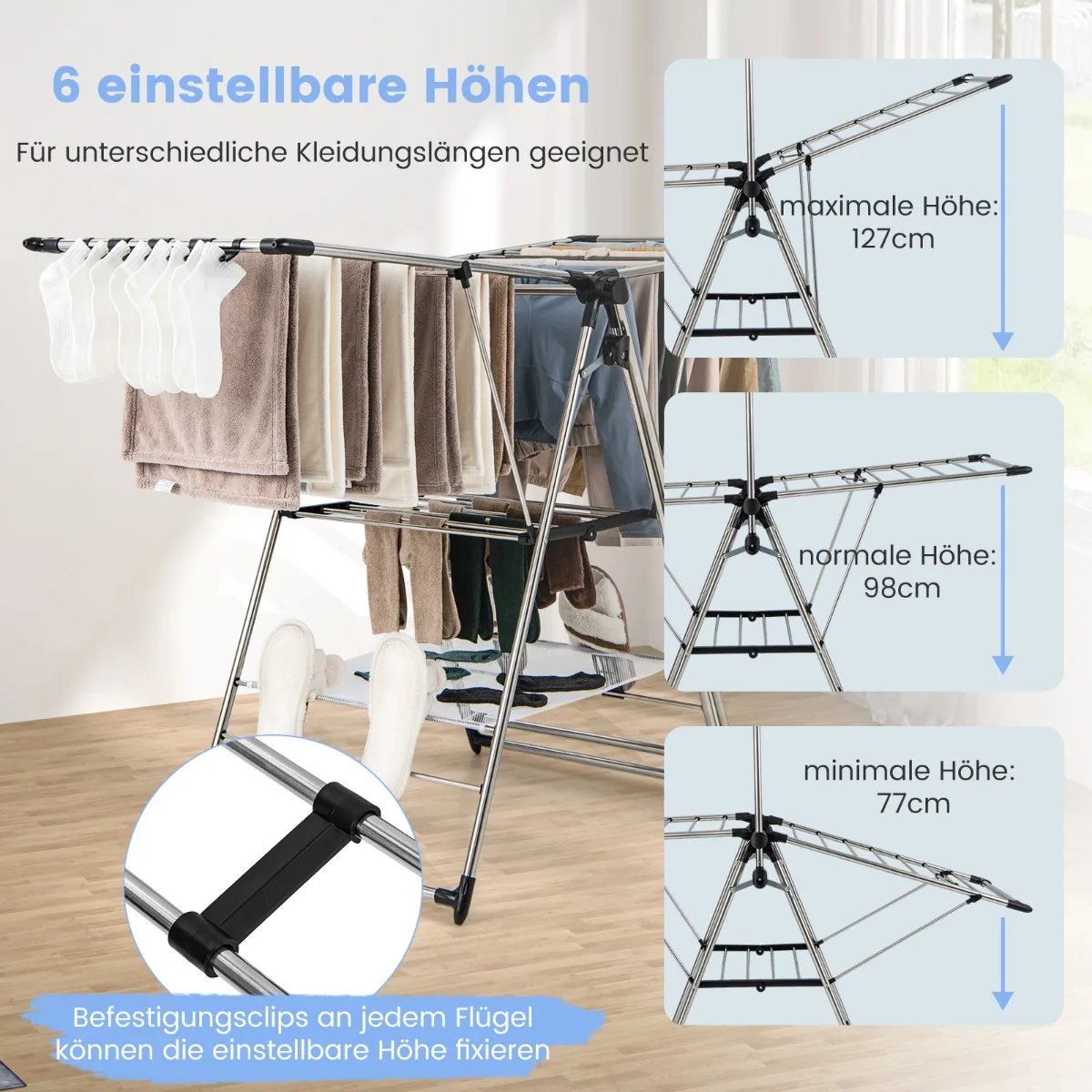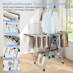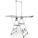 Skalbinių džiovyklė 157,5x61x192cm, sidabrinės ir juodos spalvų derinio, yra praktiškas sprendimas drabužių džiovinimui ir kitiems namų erdvės poreikiams. Ši aliuminio konstrukcija su reguliuojamais sparnais suteikia daug vietos skalbiniams ir yra tinkama naudoti įvairiuose kambariuose.