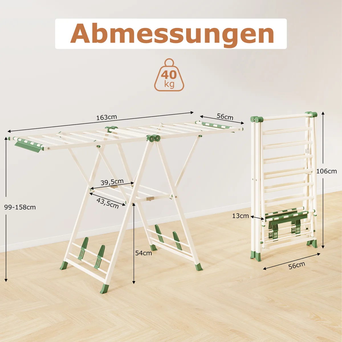 - Reguliuojamo aukščio sparnai nuo 99 cm iki 148/158/168 cm leidžia džiovinti trumpesnius ir ilgesnius drabužius.