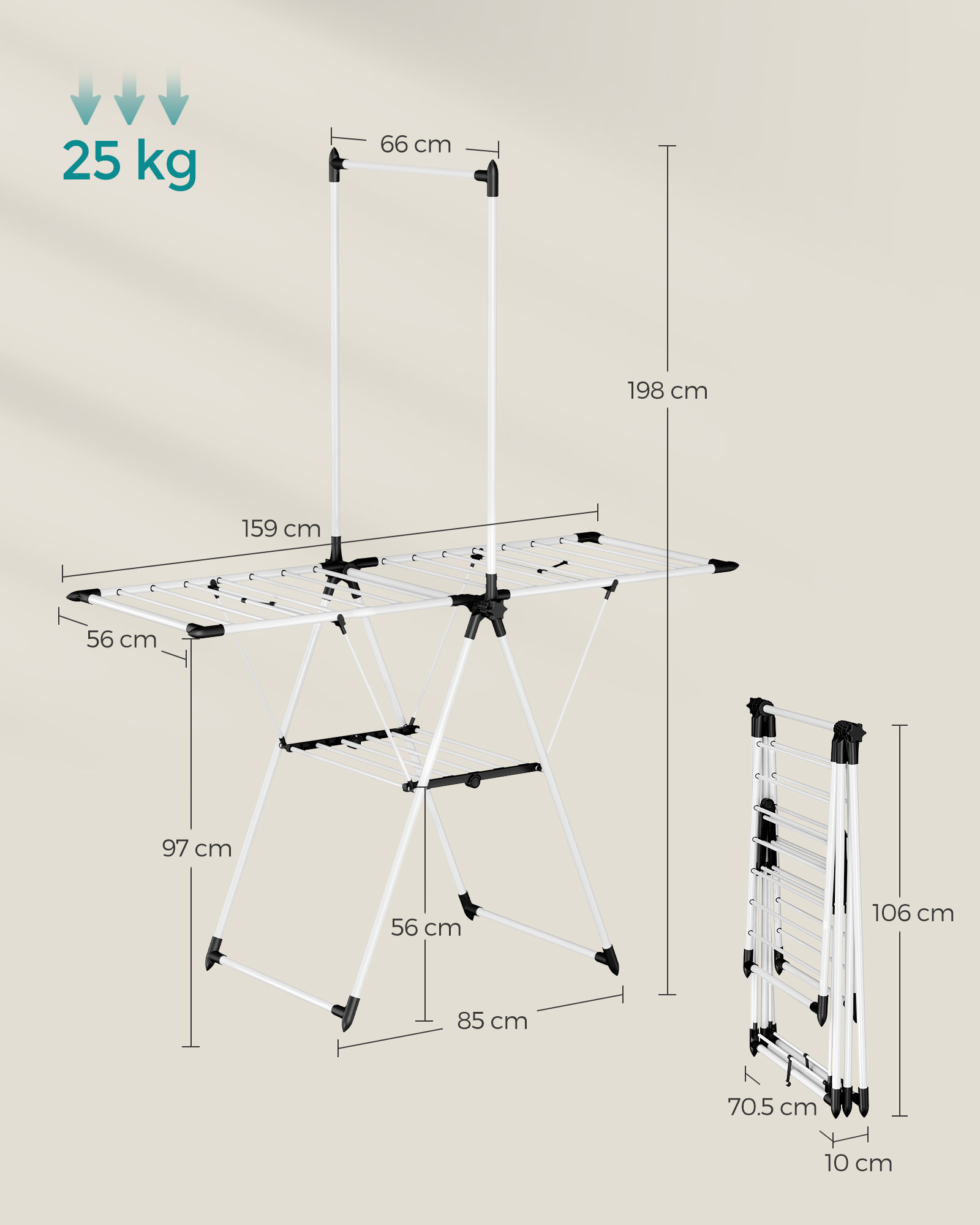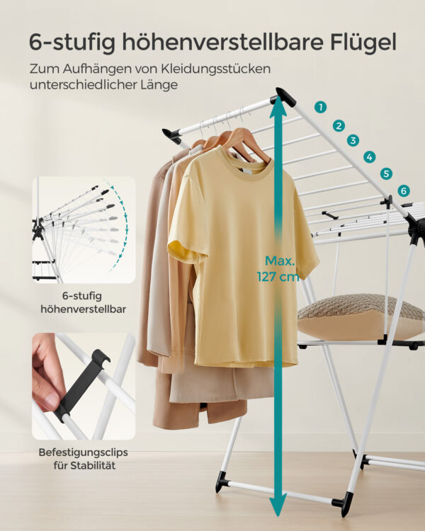 - Stovo dydis išskleidus: 66 x 159 x 198 cm (D x P x A) – pakankamai vietos visiems Jūsų skalbiniams.