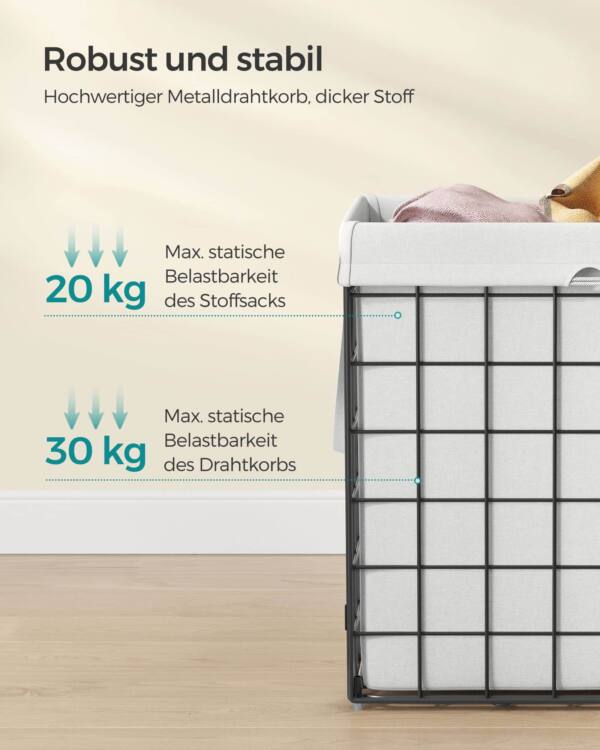 Šio skalbinių krepšelio matmenys yra 58 x 33 x 58 cm , o jo svoris – tik 3,9 kg, todėl jį lengva perkelti iš vienos vietos į kitą. Maksimali maišelio statinė apkrova yra 20 kg, o krepšelio apkrova – 30 kg, todėl jis gali atlaikyti didelį kiekį skalbinių.