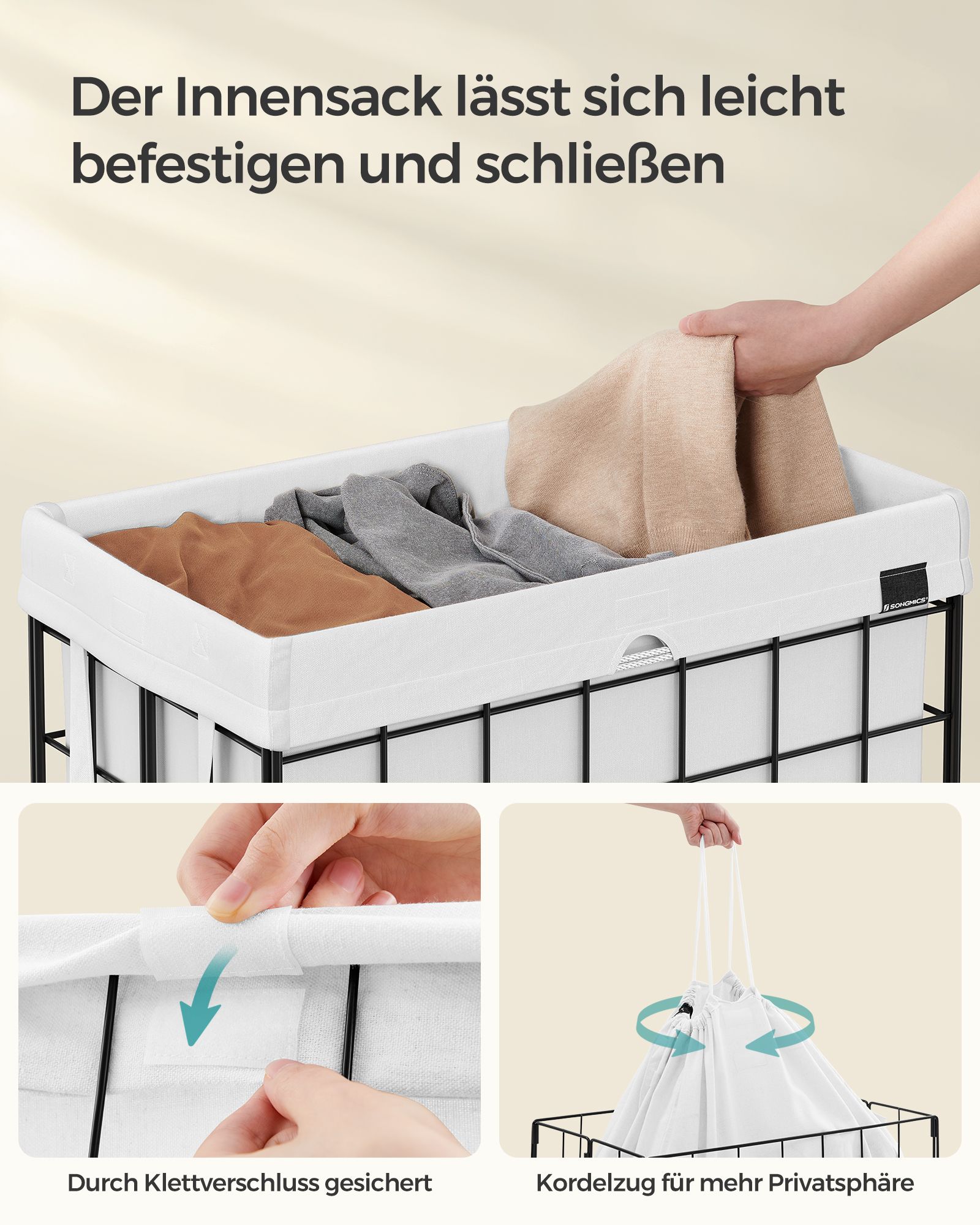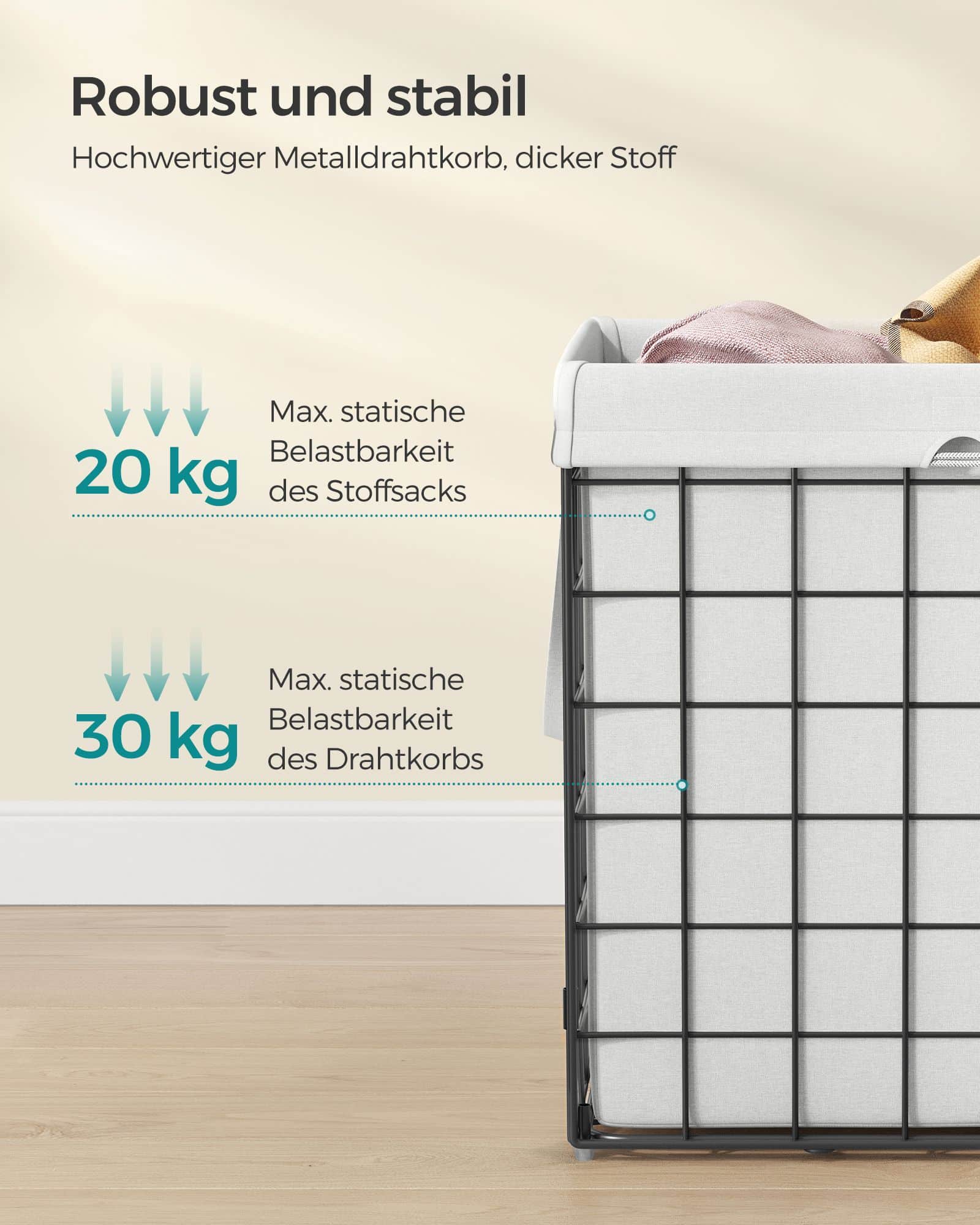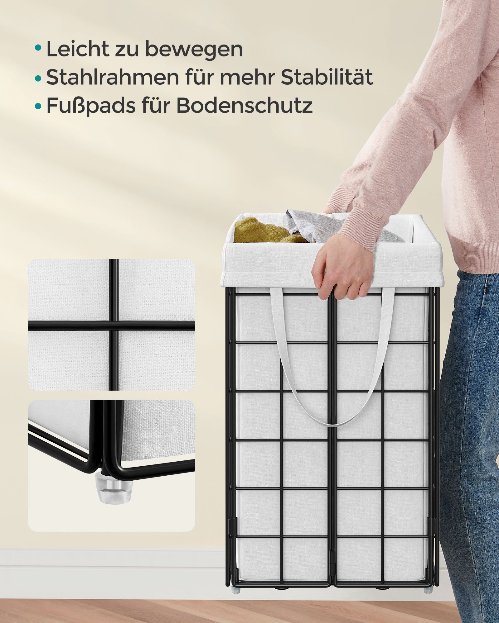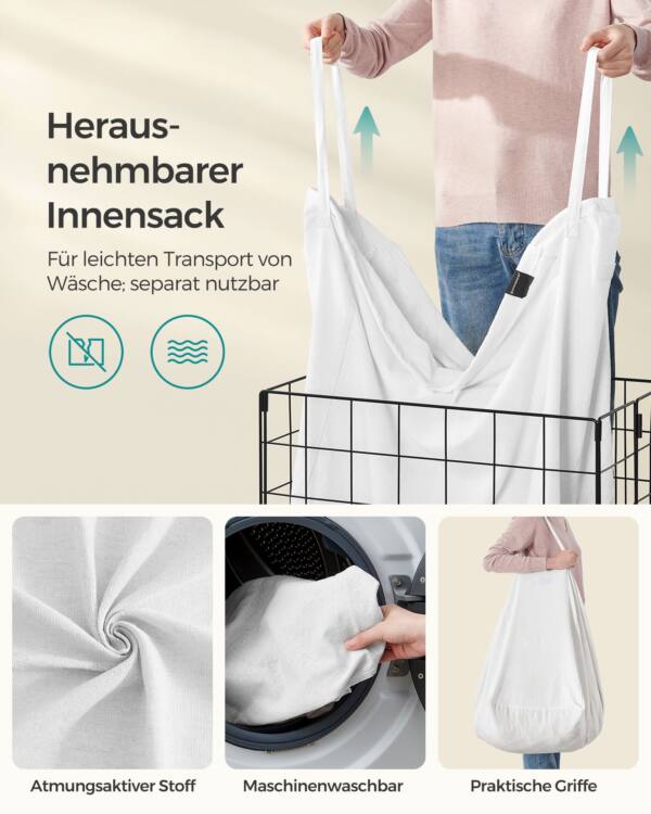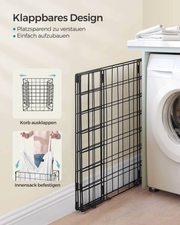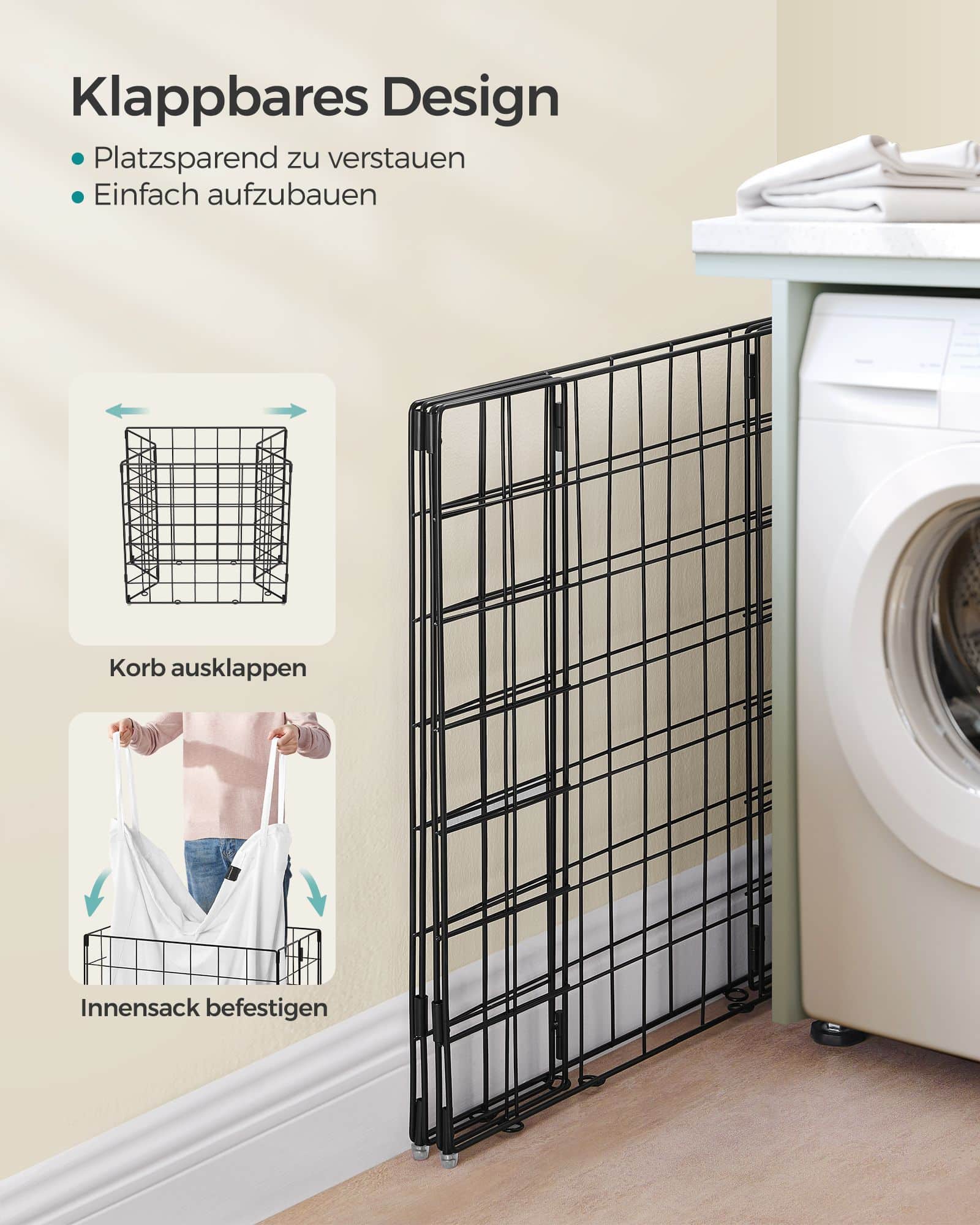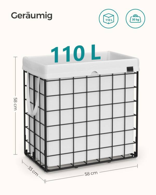 Krepšelis pagamintas iš plieno ir medvilnės-poliesterio mišinio, todėl yra patvarus ir lengvai prižiūrimas. Jo talpa siekia 110 litrų, todėl jame tilps daug skalbinių.