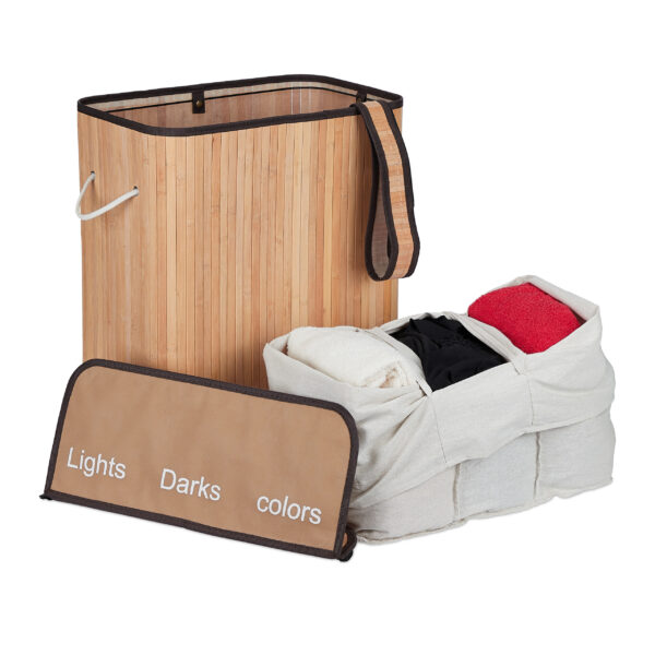 - Segmentinis dizainas: Krepšelis turi tris atskirus skyrius, leidžiančius patogiai suskirstyti skalbinius į šviesius, tamsius ir spalvotus.