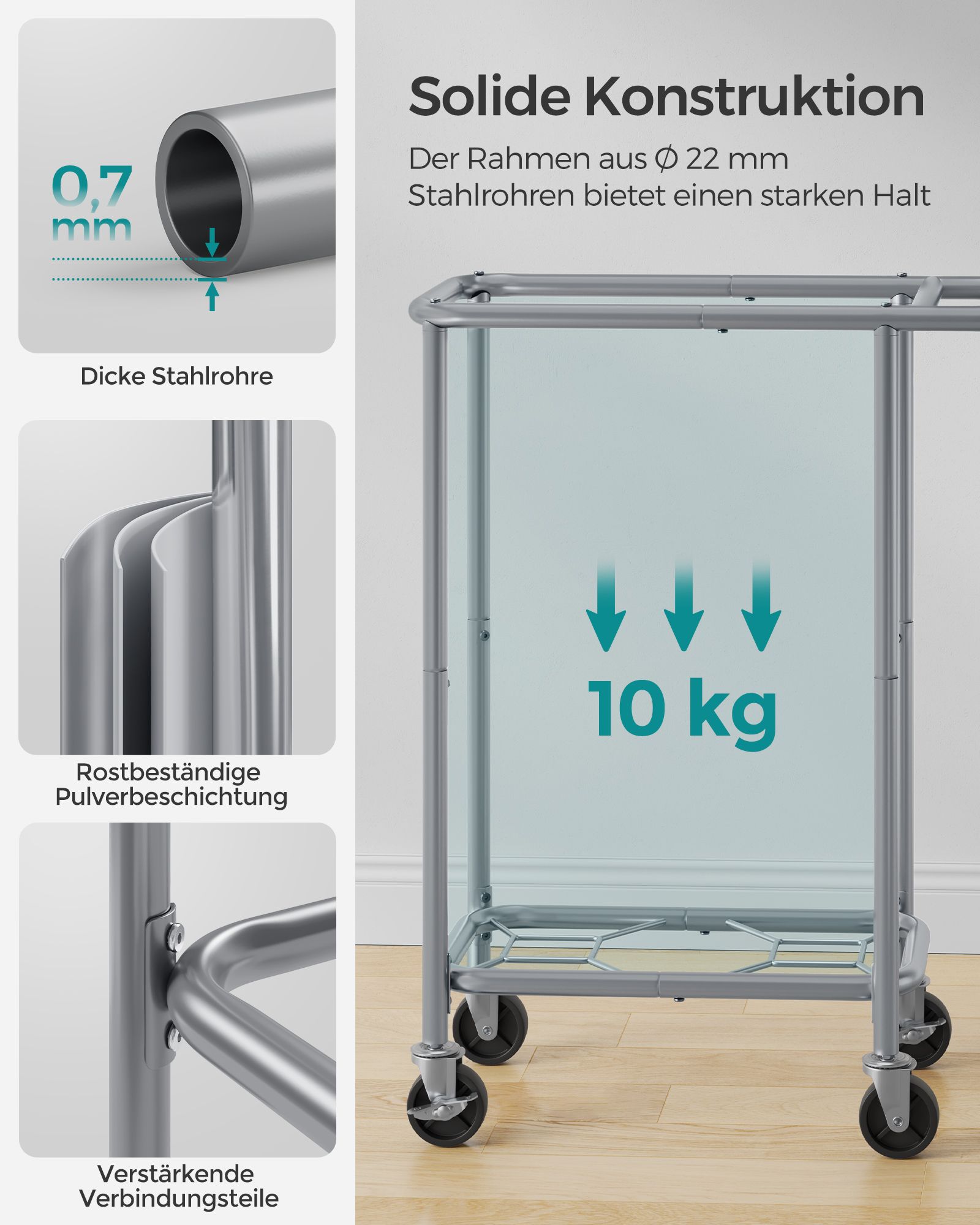 Šis skalbinių krepšelis yra ne tik talpus, bet ir lengvai transportuojamas dėl patogių ratukų. Tvirtas plieninis rėmas užtikrina ilgaamžiškumą, o aukštos kokybės 600D Oksfordo audinys yra atsparus dėvėjimuisi ir lengvai valomas. Tai puikus sprendimas jūsų namų tvarkai ir patogumui.