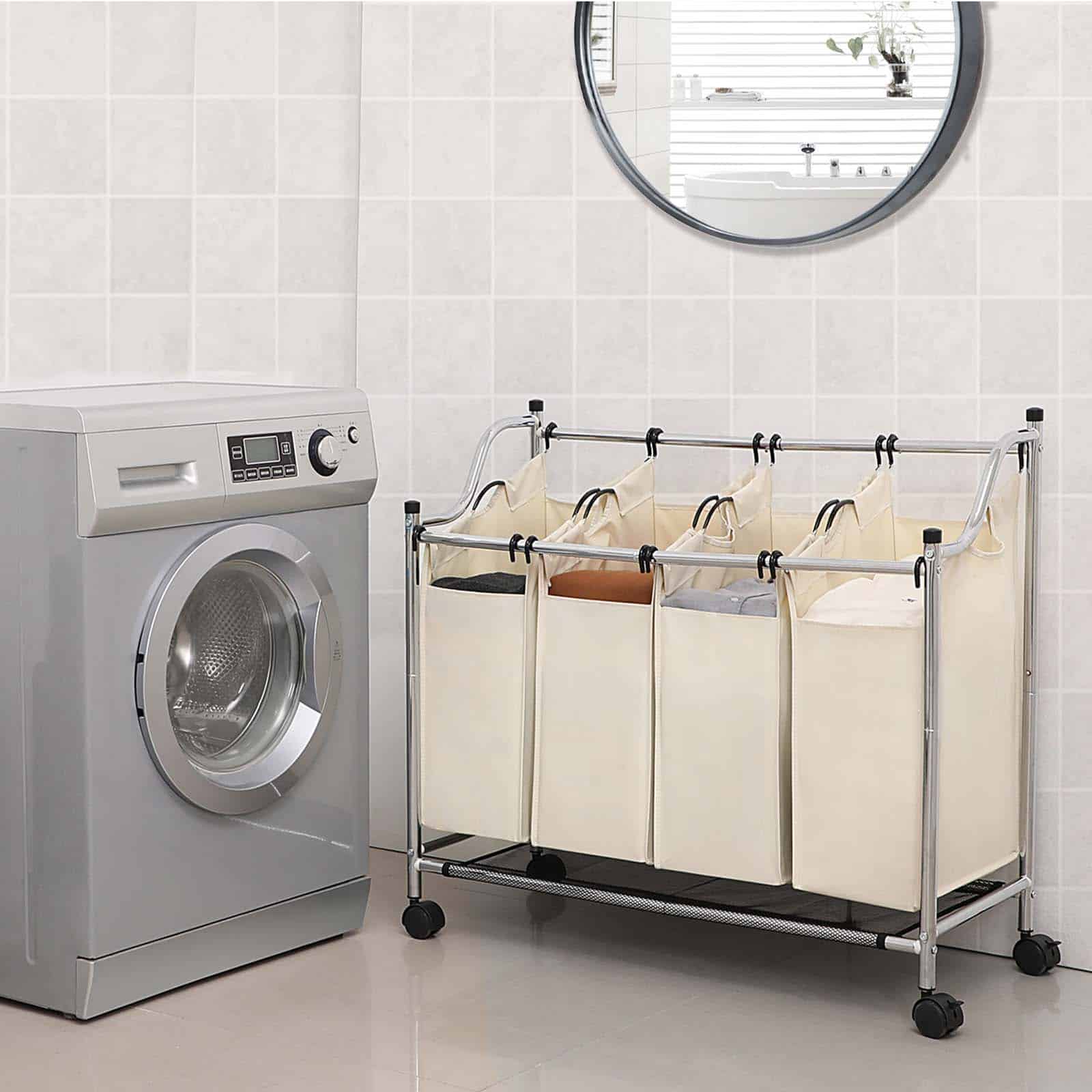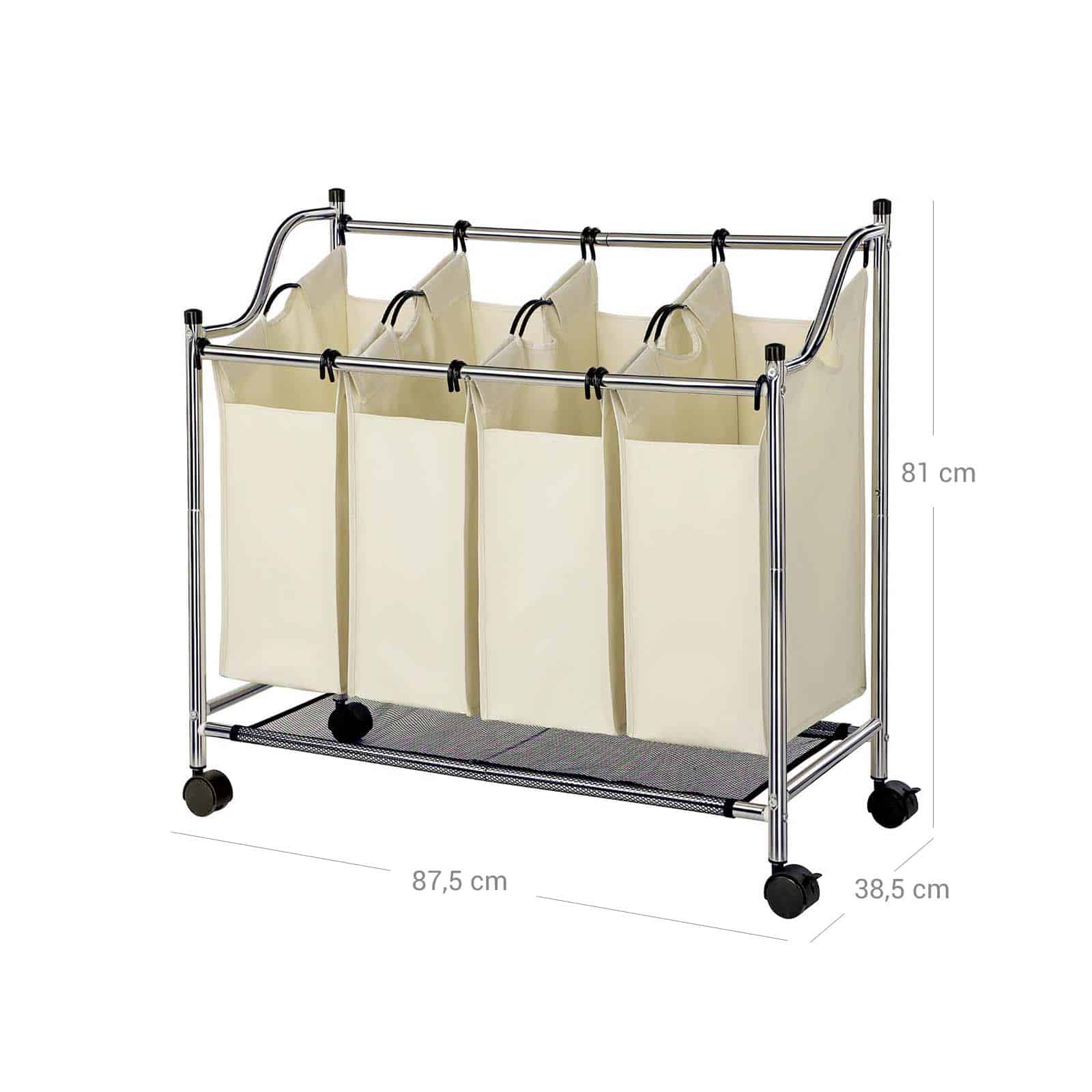 Mažų matmenų ir didelės talpos skalbinių krepšelis ant ratukų 4 x 35 L, smėlio spalvos, puikiai tinka bet kuriame kambaryje, pavyzdžiui, svetainėje, miegamajame ar vonios kambaryje. Jame galima laikyti ne tik skalbinius ir rankšluosčius, bet ir žaislus bei žurnalus.