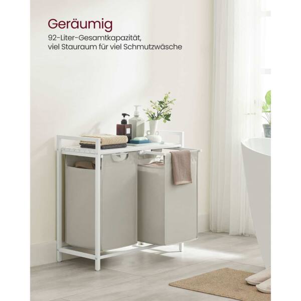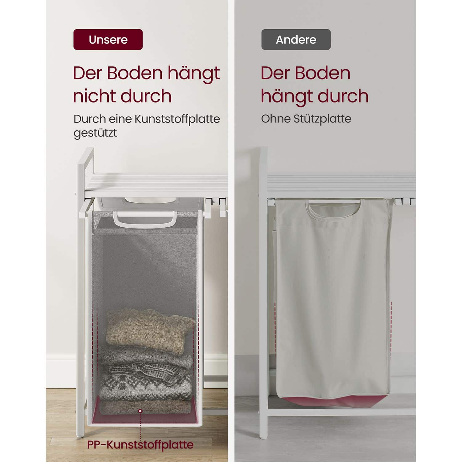 Pagamintas iš aukštos kokybės medžio dulkių plokštė (MDF) (vidutinio tankio medienos plaušų plokštės), plieno ir Oksfordo audinio, šis baldas yra tvirtas ir ilgaamžis. Bendras dydis yra 73 x 33 x 72 cm , todėl jis neužims daug vietos, tačiau suteiks pakankamai vietos jūsų skalbiniams.