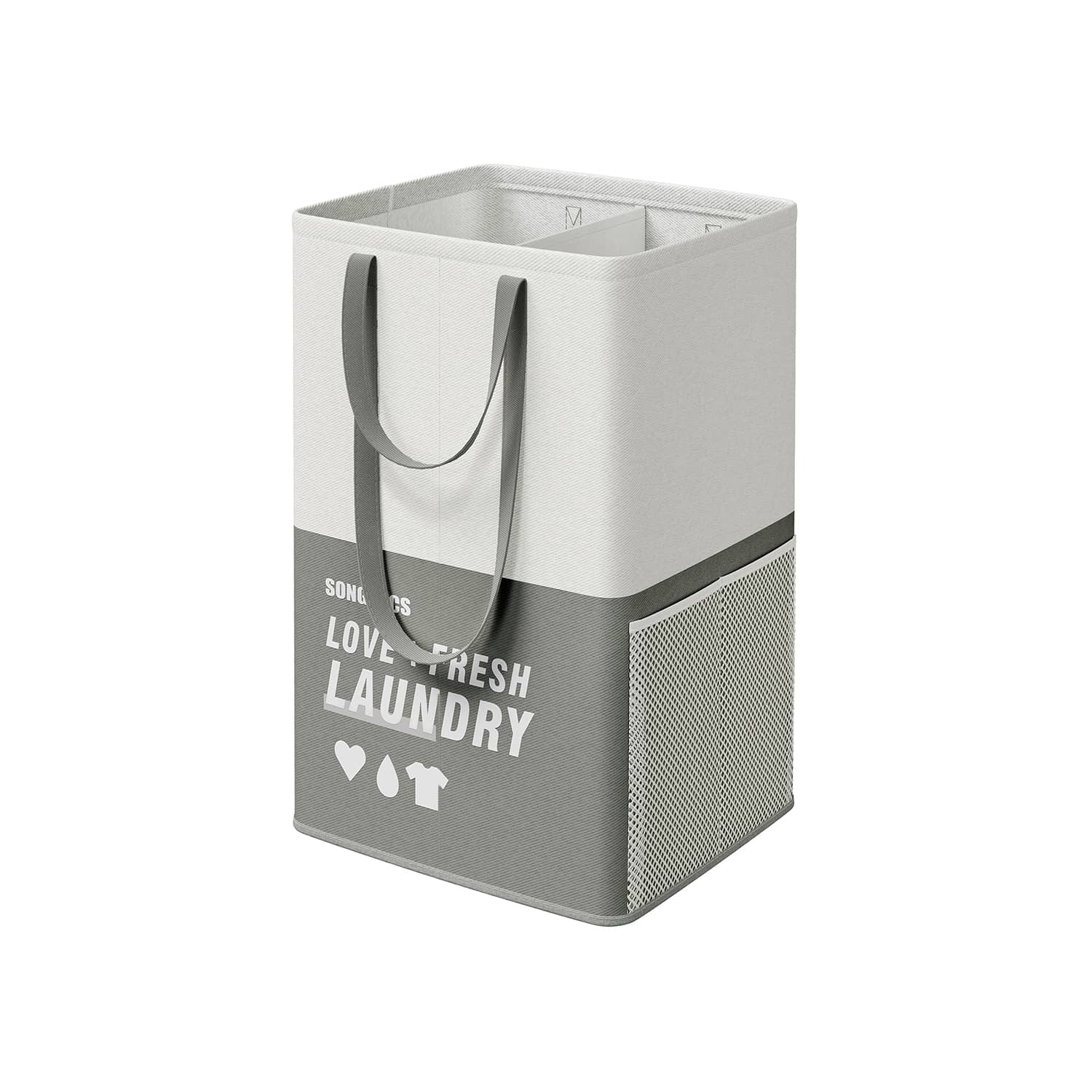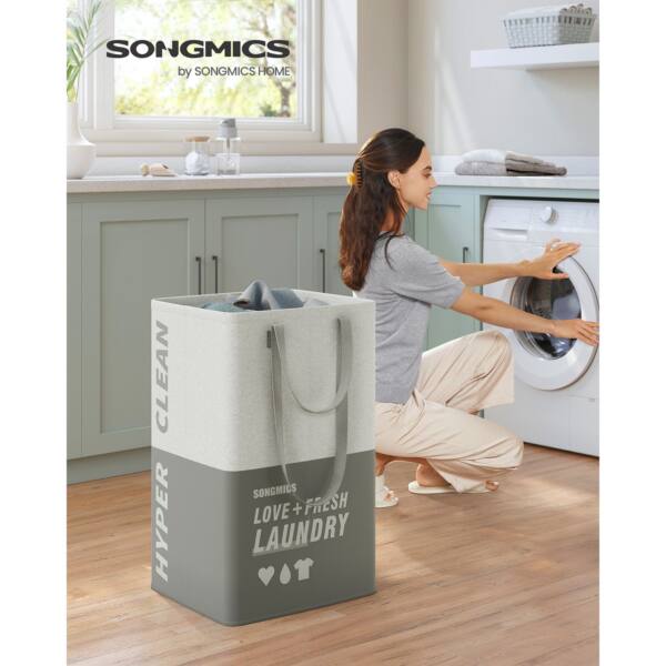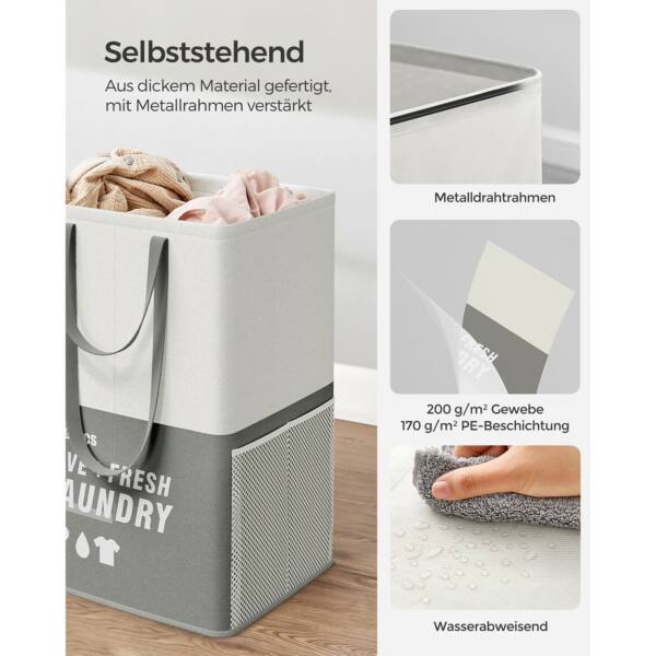 Šis tamsiai pilkos spalvos skalbinių krepšelis su 2 skyriais yra puikus sprendimas tvarkai palaikyti jūsų namuose. Pagamintas iš aukštos kokybės 200 g/m² poliesterio audinio su 170 g/m² PE danga, jis yra patvarus ir ilgaamžis.