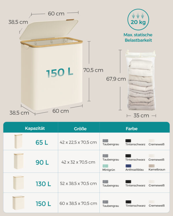 Maksimali statinė apkrova yra 20 kg, todėl galite saugiai laikyti įvairius skalbinius. Šis krepšys ne tik funkcionalus, bet ir stilingas, todėl puikiai tiks jūsų namų interjerui.
