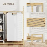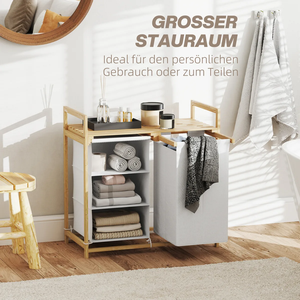 Optimizuokite savo skalbimo rutiną naudodami HOMCOM skalbinių krepšelį su lentyna! Šis stilingas nešvarių drabužių vėdiklis turi ištraukiamą skalbinių krepšį ir medžiaginį stalčių, todėl galėsite lengvai rūšiuoti skalbinius. Skalbinių rūšiavimo stalčiuje yra net trys skyriai jūsų skalbikliui ir audinių minkštikliui. Viršutinėje laikymo vietoje sukuriama daugiau vietos viskam, ko jums reikia. Elegantiškas bambuko rėmas suteikia natūralumo bet kokiai patalpai.