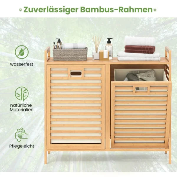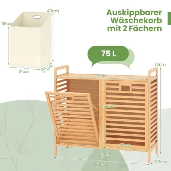 Skalbinių krepšys 80x30x72 cm, šviesiai rudos spalvos, skirtas patogiam ir tvarkingam skalbinių rūšiavimui. Bambuko rėmas ir dvigubi medžiaginiai krepšiai leidžia lengvai laikyti ir pernešti drabužius, o papildoma viršutinė lentyna suteikia vietos plovikliui ar kitiems skalbimo reikmenims.