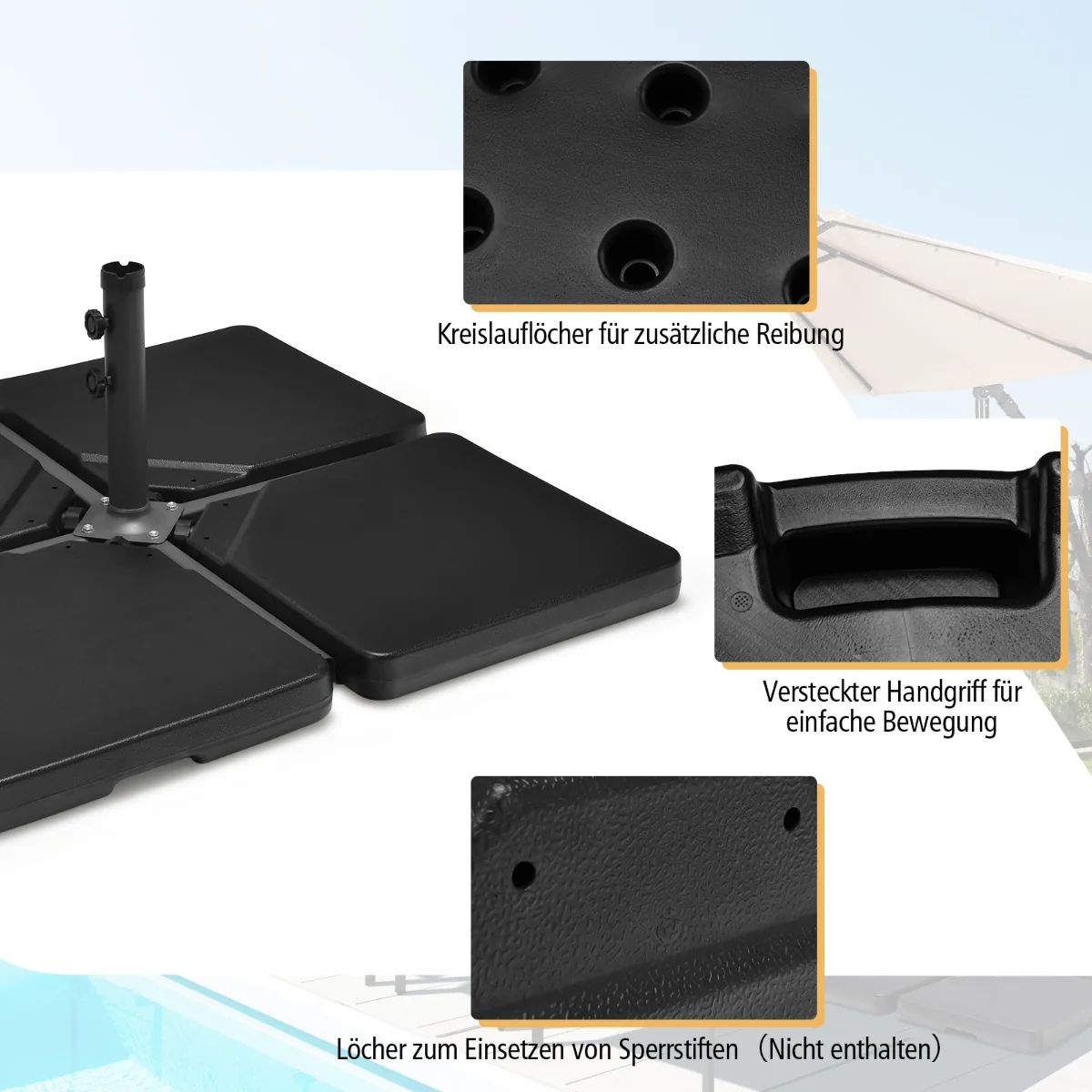 - Keturių dalių kvadratinis konstrukcinis pagrindas, skirtas pritvirtinti prie skėčio pagrindo (nepridedamas).