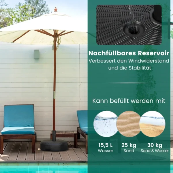 • Užpildomas skėčio pagrindas, kurio matmenys 45 x 30 cm (Ø x H) ir svoris užpildžius iki 18 kg.
