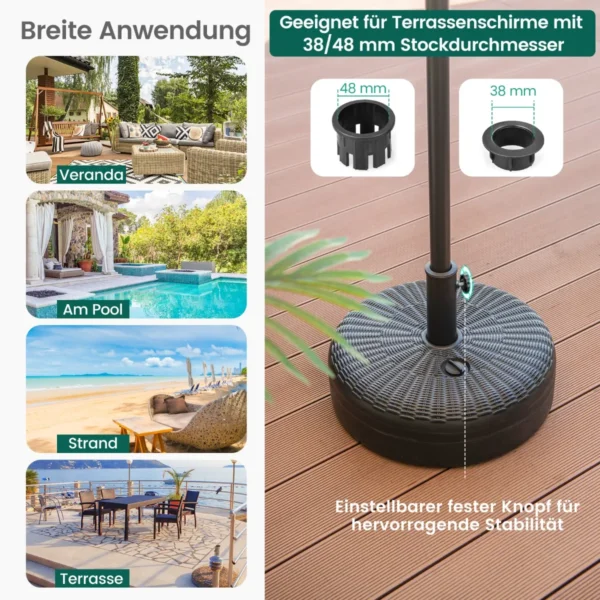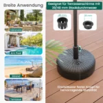 Skėčio pagrindas 45×30 cm, juodos spalvos, skirtas užtikrinti terasos ar kiemo skėčio stabilumą. Užpildomas vandeniu arba smėliu, jis pritaikytas daugeliui lauko skėčių su 38 ir 48 mm stulpo skersmeniu. Pagerinkite skėčio atsparumą vėjui ir patogiai naudokite svertinį pagrindą įvairiose lauko zonose.