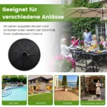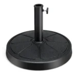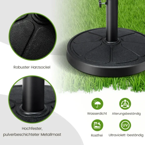 Skėčio pagrindas 45x35cm, juodos spalvos, užtikrina stabilų ir saugų lauko skėčio stovėjimą. Dėl tvirto dervos korpuso ir metalinio atraminio strypo šis skėčio pagrindas yra pritaikytas įvairių dydžių lauko skėčiams. Tinkamas naudoti terasose, soduose ir kitose lauko erdvėse.