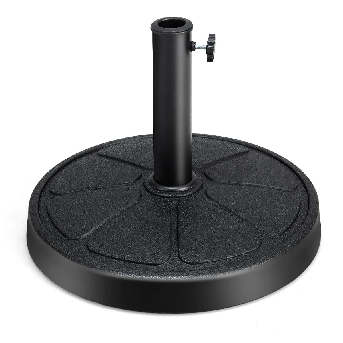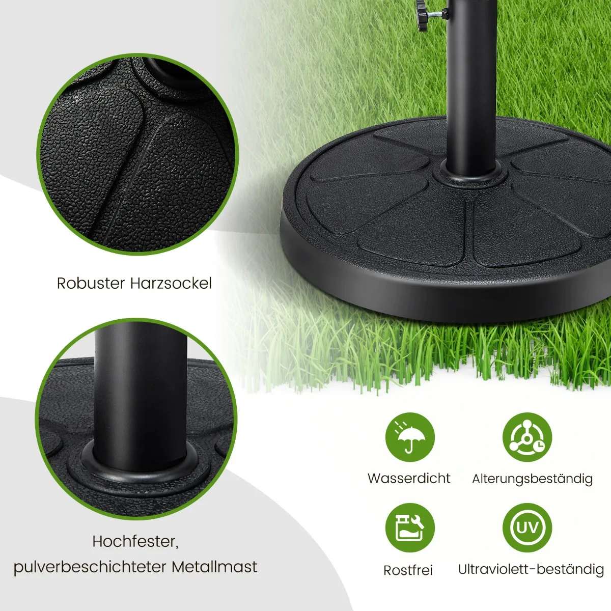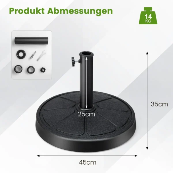 • Apvalus, 45 cm skersmens skėčio pagrindas sveria 14 kg ir užtikrina tvirtą atramą lauko skėčiui.
