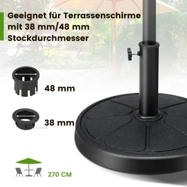 • Pagrindas turi du adapterius (38 mm ir 48 mm skersmens), tinkamus daugumai standartinių 270 cm skėčių.