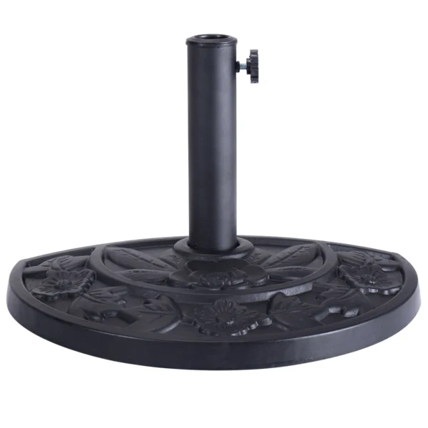Skėčio pagrindas 50x25x33cm, juodos spalvos, užtikrina stabilų skėčio laikymą tiek terasoje, tiek balkone. Pusapvalė forma leidžia tvirtinti pagrindą prie sienos, o juoda spalva dera su įvairiais lauko baldais.