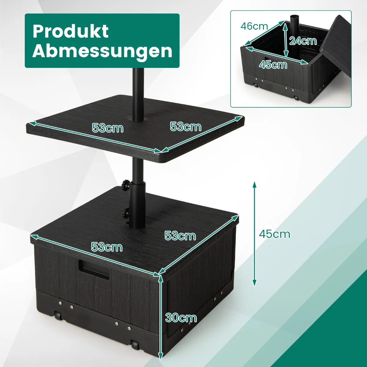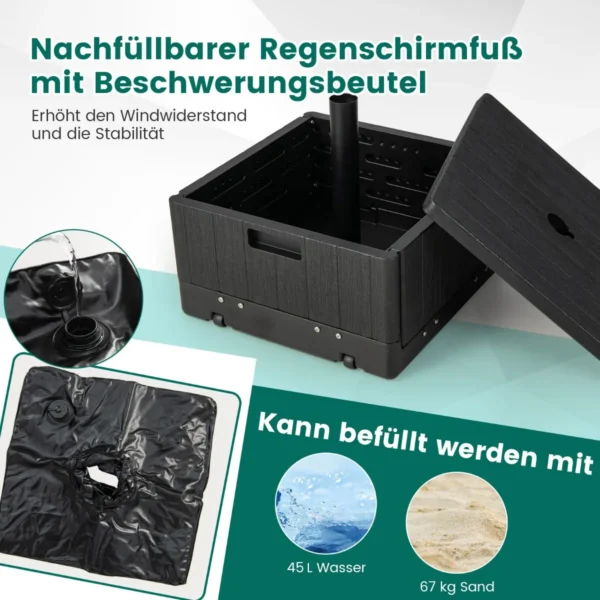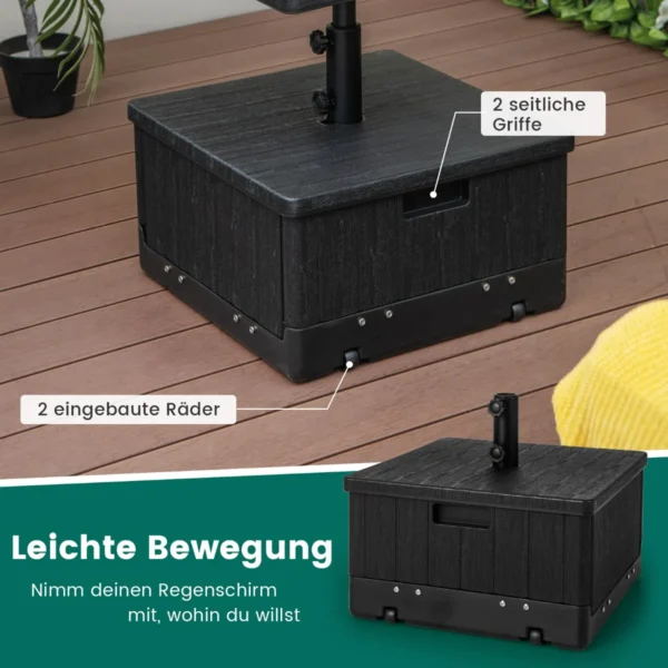 Skėčio pagrindas 53x53x45 cm juodos spalvos yra praktiškas sprendimas jūsų lauko skėčio tvirtinimui ir stabilumui užtikrinti. Šis daugiafunkcis stovas pasižymi universalumu – jį galima naudoti kaip skėčio stovą, staliuką ar sodinuką. Pagamintas iš patvarios HDPE medžiagos ir metalo, tinka įvairių dydžių lauko skėčiams.