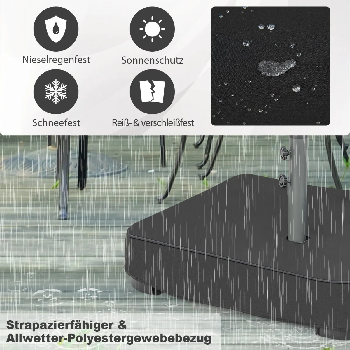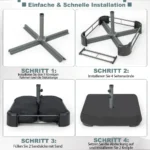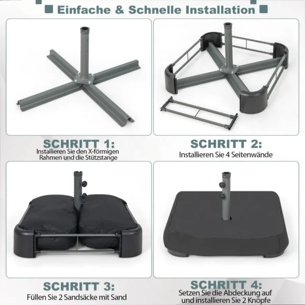 - Lengvas surinkimas: sumontuokite rėmą, užpildykite smėlio maišus ir pritvirtinkite skėtį.