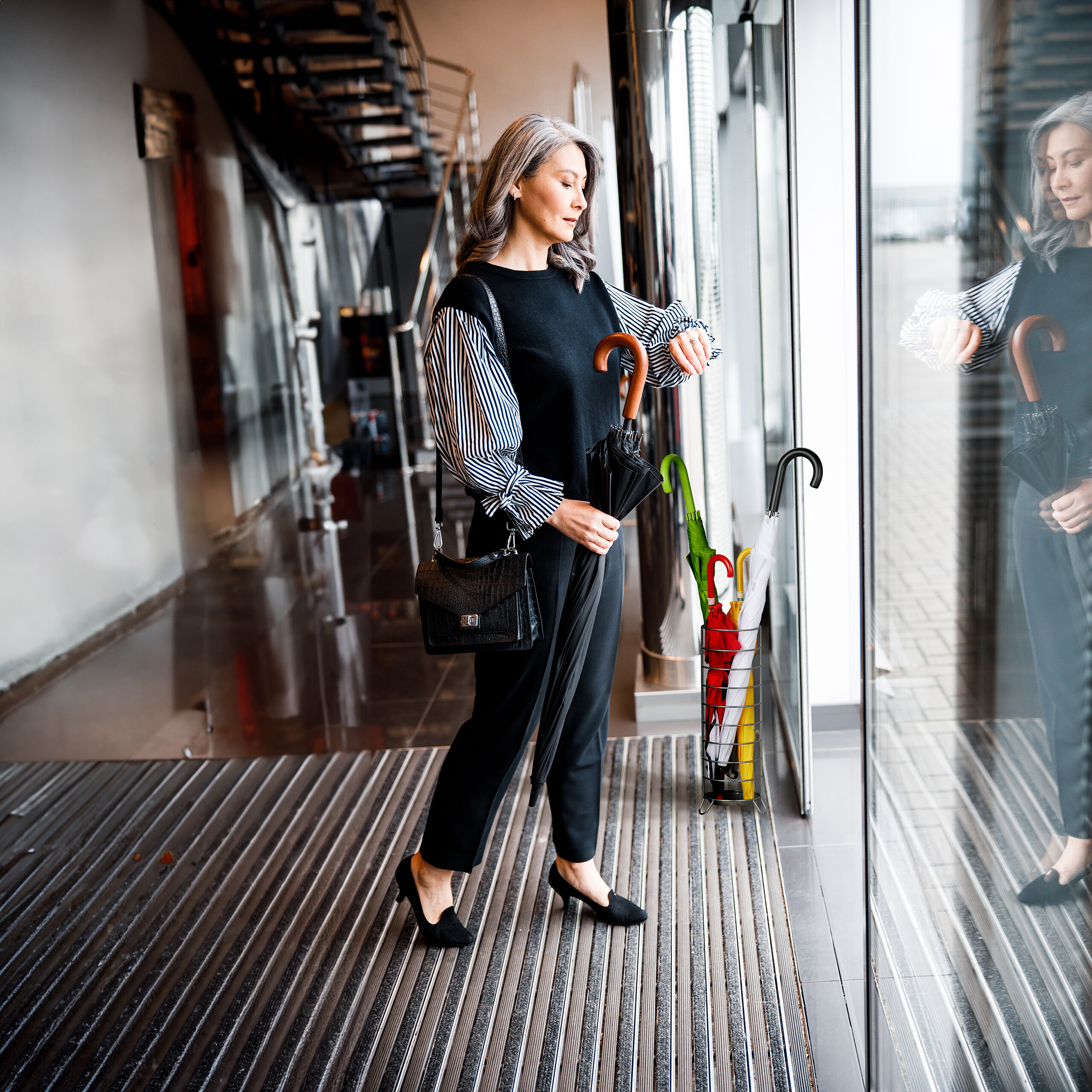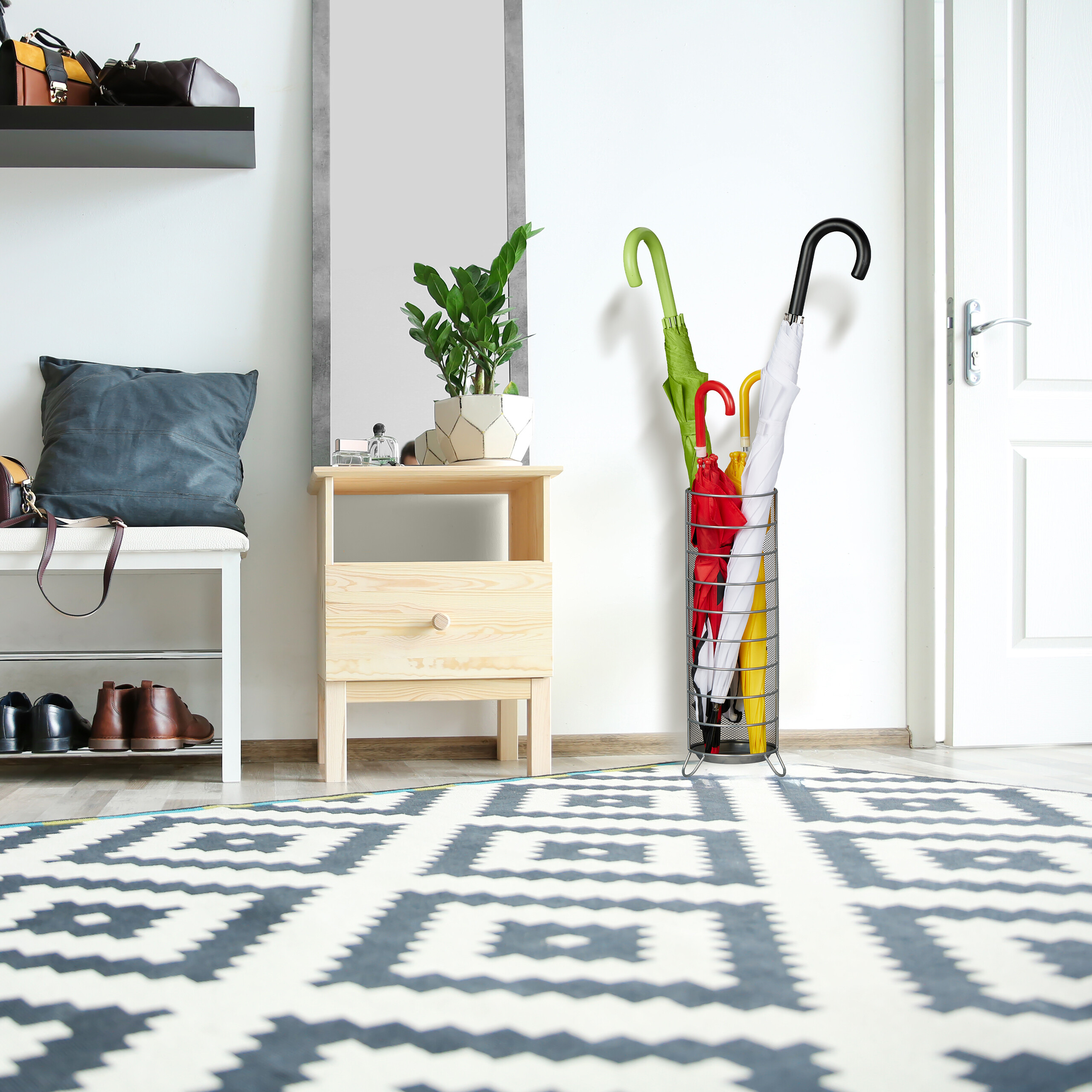 - Funkcionalumas: Skėčių stovas neleidžia lašančiam vandeniui pasiekti grindų, užtikrindamas švarą ir tvarką.