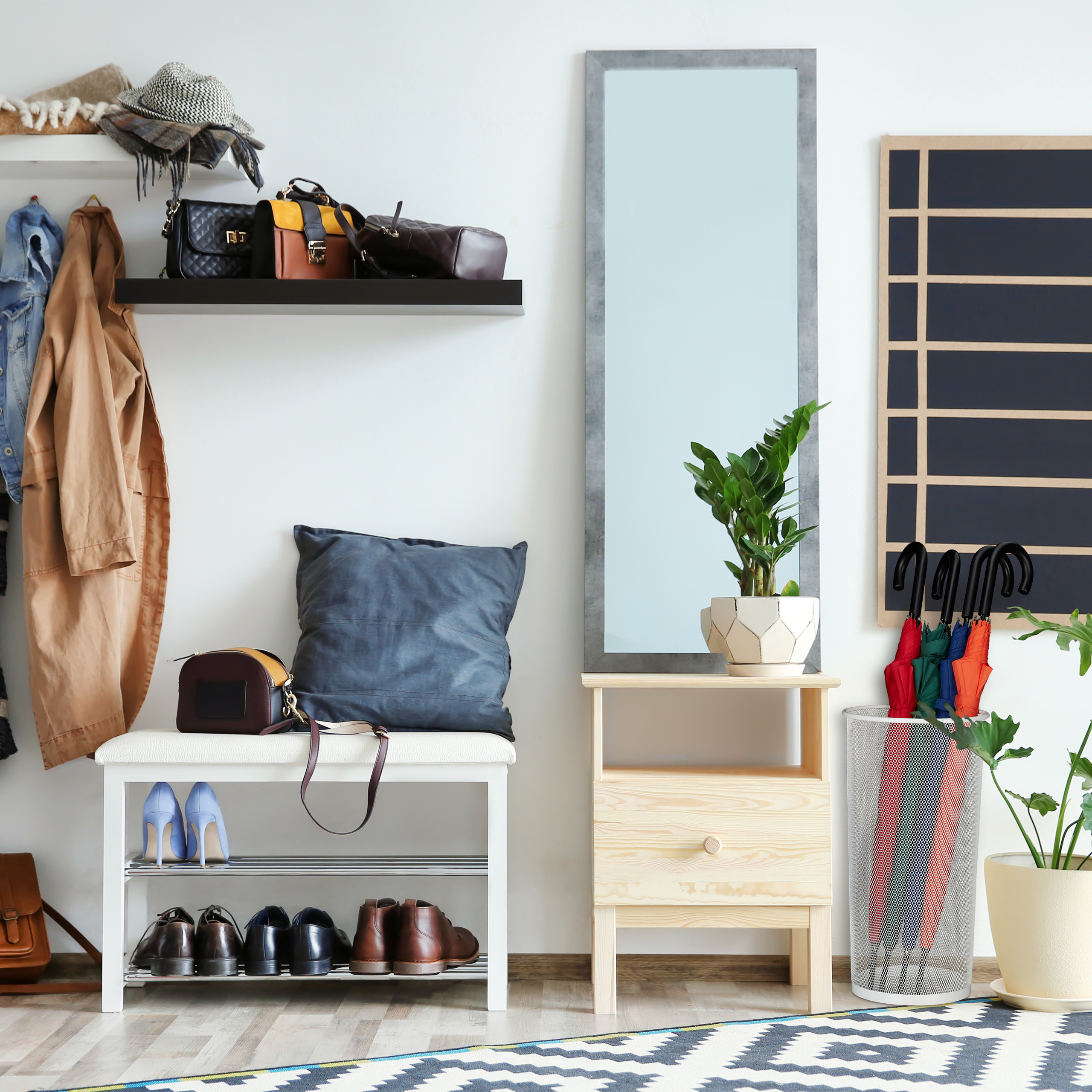 - Praktiškumas: Pastatykite stovą įėjimo zonoje, kad skėčiai ir lazdos visada būtų po ranka, kai jų labiausiai reikia.