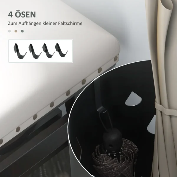 Lietingos dienos atneša skėčius. Šis elegantiškas HOMCOM skėčio pagrindas sujungia dizainą ir praktiškumą, suteikiant tam skirtą vietą skėčiams ir atrodant stilingai. Jis pagamintas iš cinkuoto plieno, tvirtas ir atsparus rūdijimui. Ø17 x 41H cm, jame telpa du dideli skėčiai, o mažesniems – keturi kabliukai. Apima nuimamą pagrindo padėklą, kad būtų lengva ištuštinti skysčius.