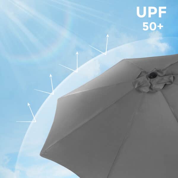 Apsauginis audinys nuo UV spindulių (UPF 50+) sudarytas iš 100 % poliesterio, yra atsparus vandeniui ir atsparus spalvoms. Be to, jame yra keletas ventiliacijos angų, kurios leidžia sodo skėčiui geriau atlaikyti vėją. Apsauginė šluostė yra nuimama ir gali būti skalbiama rankomis.