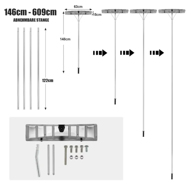 - Keturi prailginimo stulpai ir rankena suteikia lankstumą, keičiant ilgį nuo 1,48 iki 6,08 m.