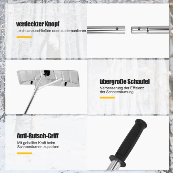 Sniego kastuvas 63x15x609 cm, sidabrinės ir juodos spalvos, skirtas efektyviam sniego ir šiukšlių valymui nuo stogų bei kitų paviršių. Reguliuojamo ilgio konstrukcija leidžia pritaikyti įrankį pagal konkrečius poreikius, užtikrinant saugų darbą be lipimo ant stogo.