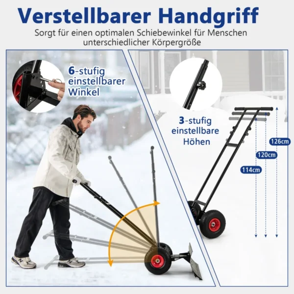Sniego kastuvas 91,5x53x126 cm juodos spalvos skirtas efektyviam sniego valymui dideliuose plotuose. Įrengtas reguliuojamas kastuvo ašmenų kampas ir rankenos aukštis, užtikrina patogų darbą įvairaus ūgio naudotojams. Su dideliais neslystančiais ratais sniego valymas tampa paprastesnis net ir slidžiuose paviršiuose.