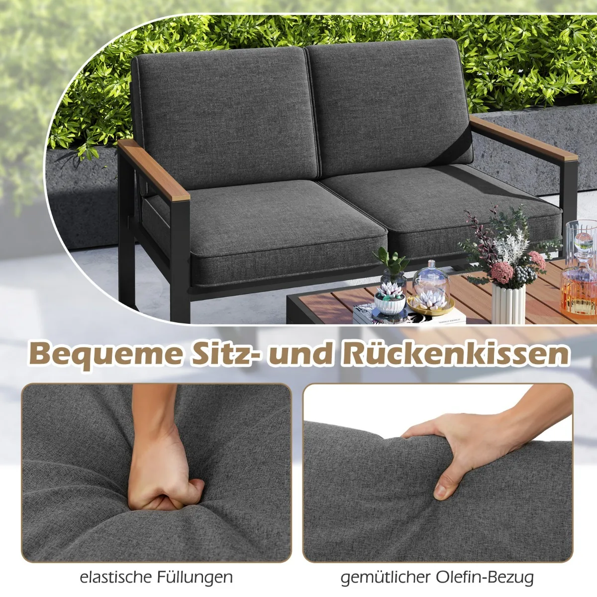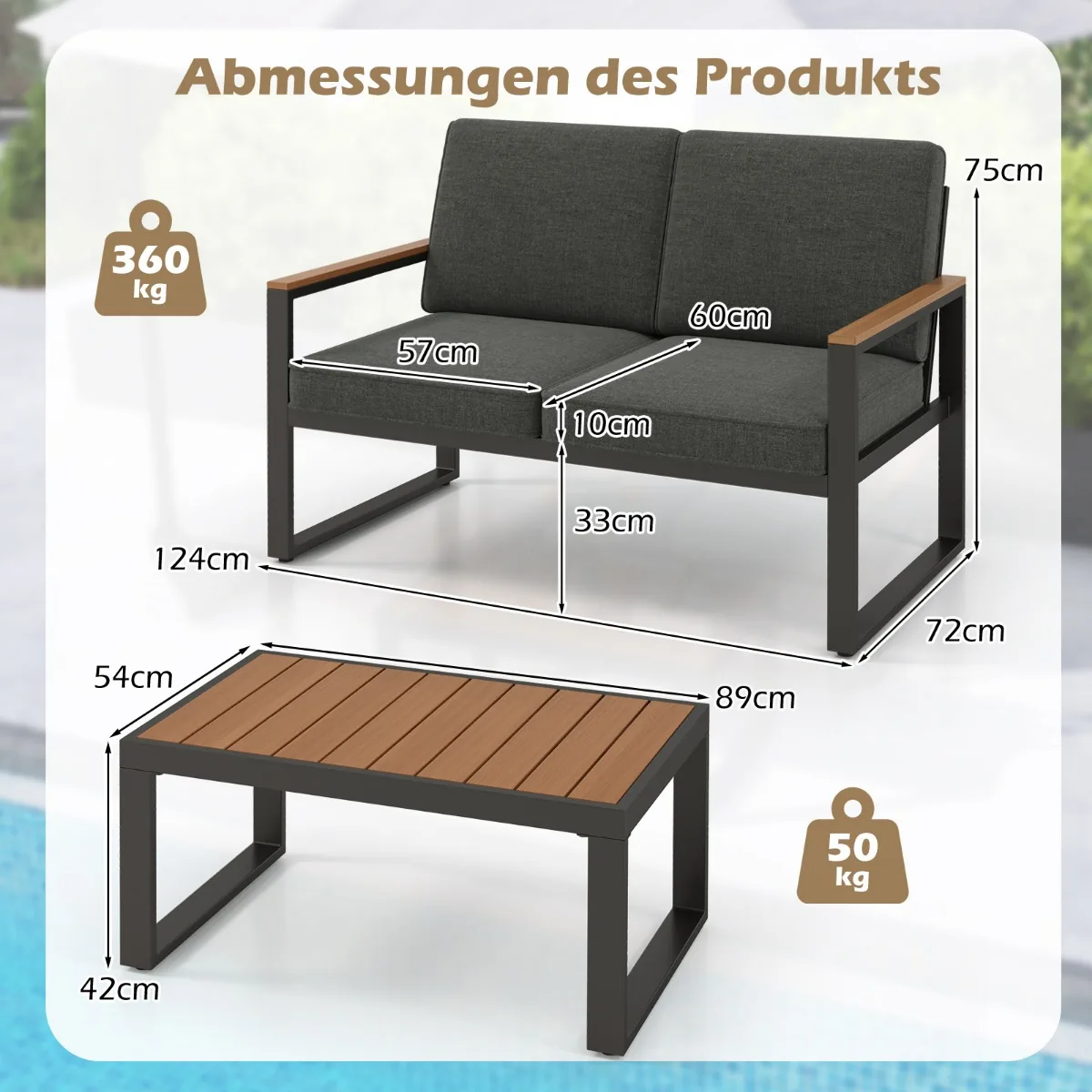 Sodo baldų komplektas iš 2 dalių yra puikus sprendimas jūsų lauko erdvei paversti patogesne ir funkcionalesne. Komplektas pagamintas iš patvaraus aliuminio ir medžio-plastiko medžiagų, todėl atsparus oro sąlygoms ir ilgaamžis. Dviejų vietų sofa su reguliuojamomis pagalvėlėmis užtikrina komfortą bei stabilumą.