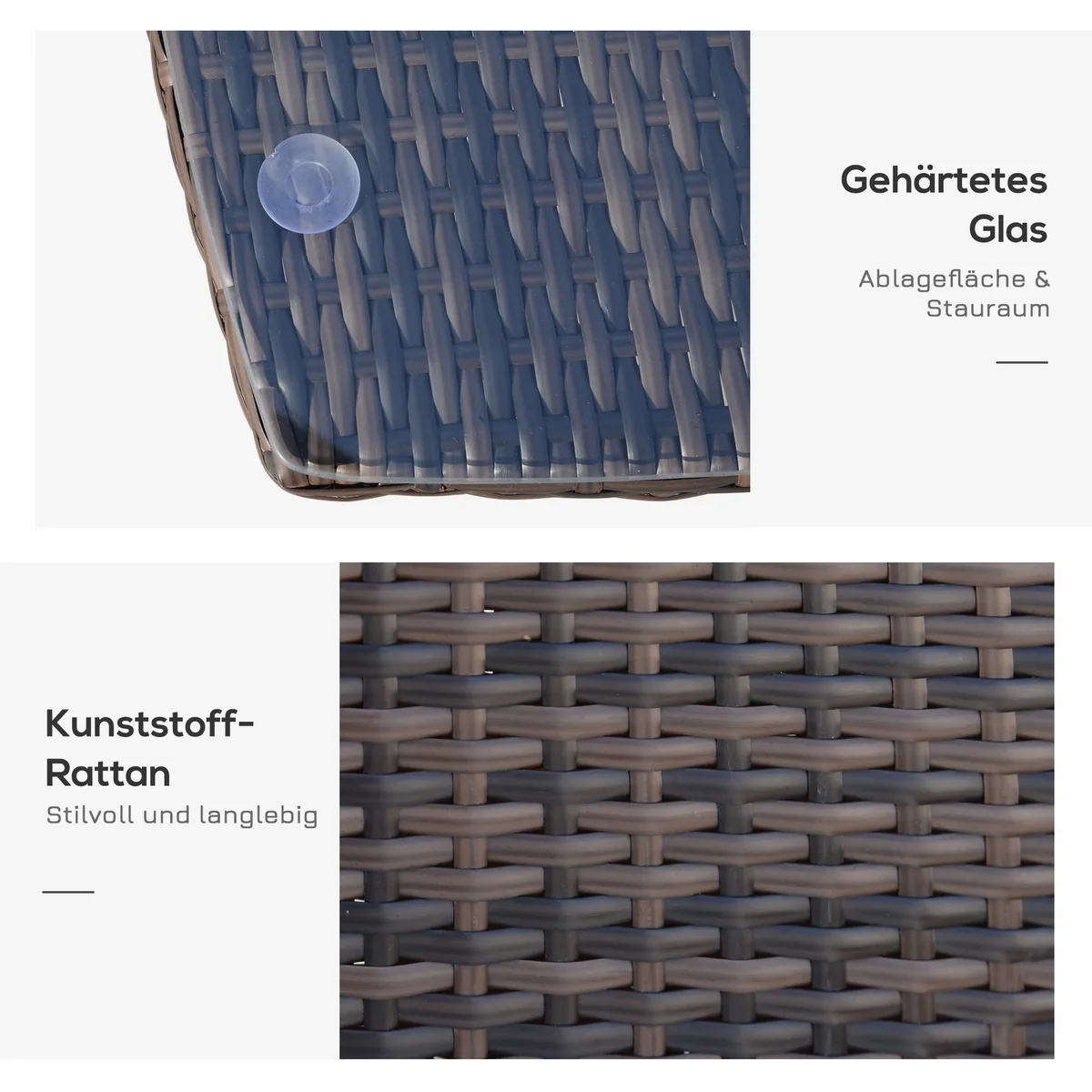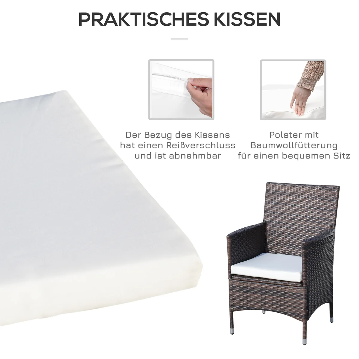Su šiuo balkono baldų komplektu dviems žmonėms iš Outsunny savo kiemui ir balkonui suteiksite stiliaus ir komforto. Iš rotango atrodančio rotango holo komplektą sudaro dvi kėdės ir stalas su grūdinto stiklo stalviršiu. Į pristatymą taip pat įeina dvi storos paminkštintos pagalvėlės su skalbiamais užvalkalais. Naudodami sėdimąją erdvę galėsite tikrai patogiai įsitaisyti gerdami kavą ar vyną.