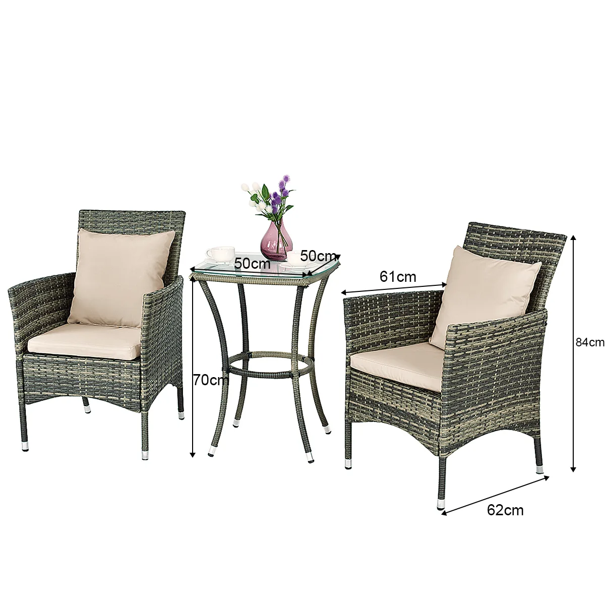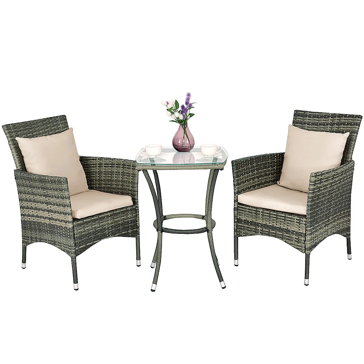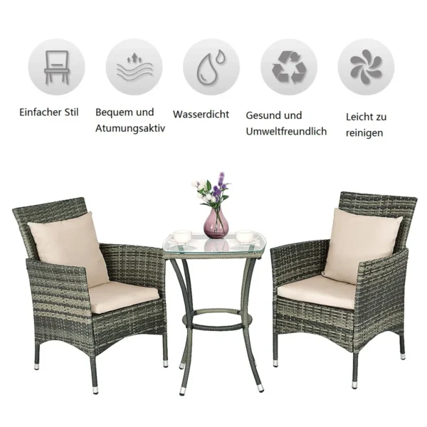 Sodo baldų komplektas iš 3 dalių, įvairių spalvų, tinkamas naudoti kieme, terasoje ar balkone. Komplektą sudaro du pinti PE rotango kėdžių modeliai su minkštomis, nuimamomis pagalvėlėmis bei kvadratinis grūdinto stiklo kavos staliukas. Šis lauko baldų rinkinys pasižymi patvarumu ir praktiškumu, skirtas mažoms lauko erdvėms.