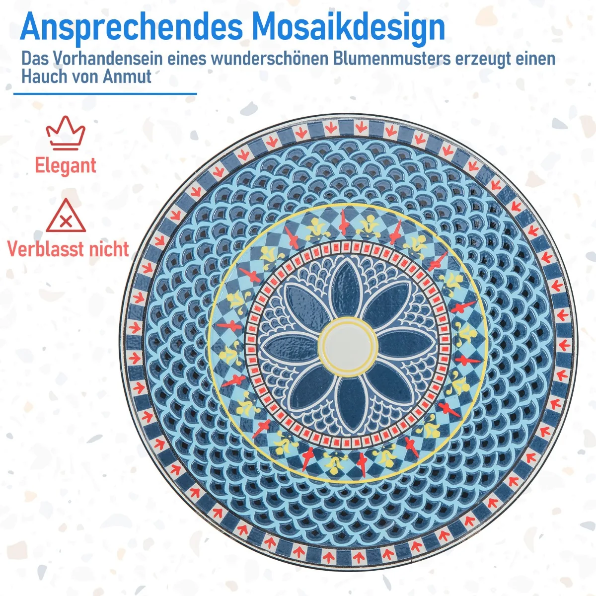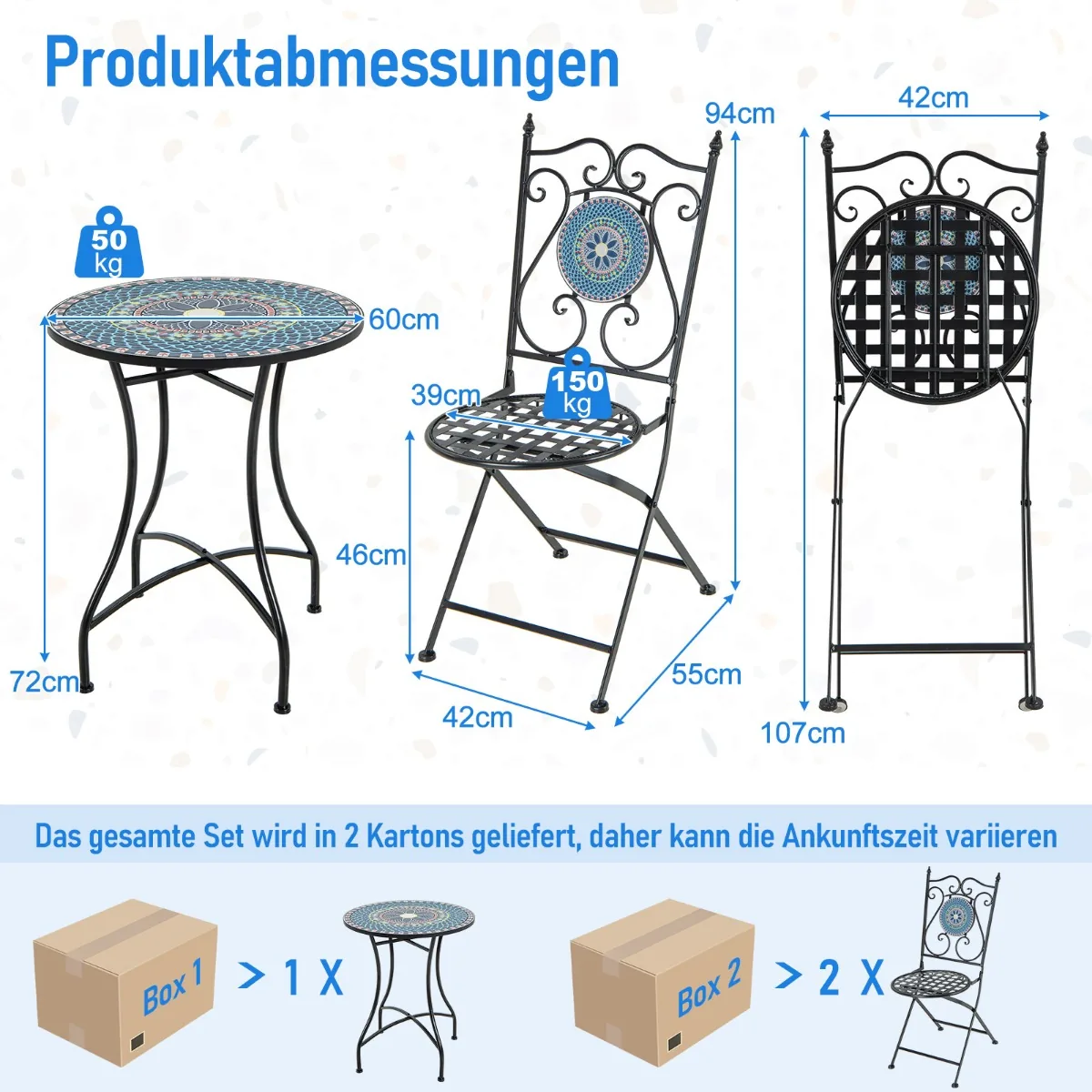 Sodo baldų komplektas iš 3 dalių puikiai tiks tiek lauko, tiek vidaus erdvėms. Komplektą sudaro dvi sulankstomos kėdės ir metalinis stalas, puoštas mozaikiniais raštais, kurie suteikia natūralų žavesį ir praktiškumą.